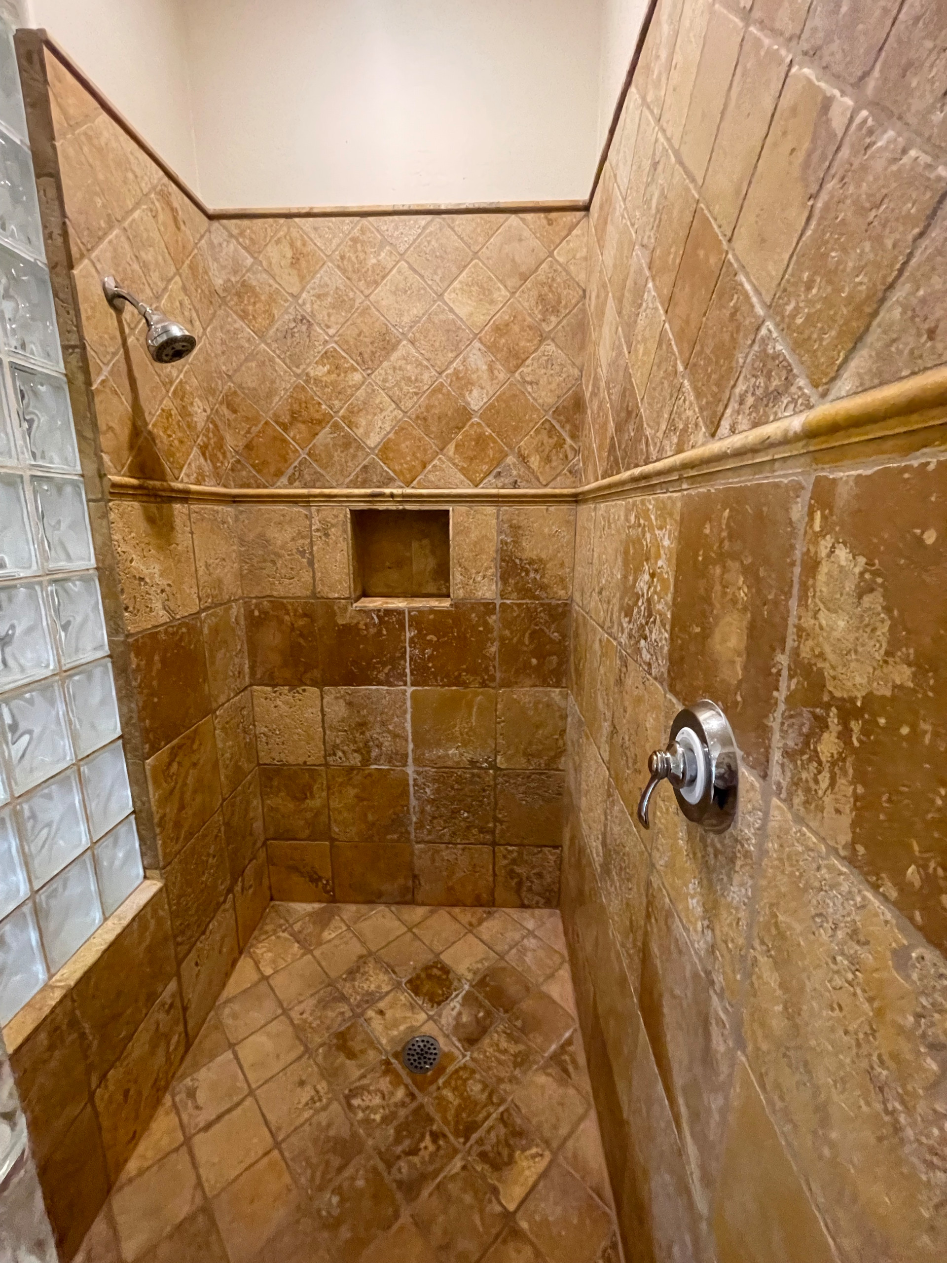After: Removing the glass block allowed the shower footprint to expand, making room for shower heads on both sides. A clear glass enclosure keeps the area feeling open and bright.