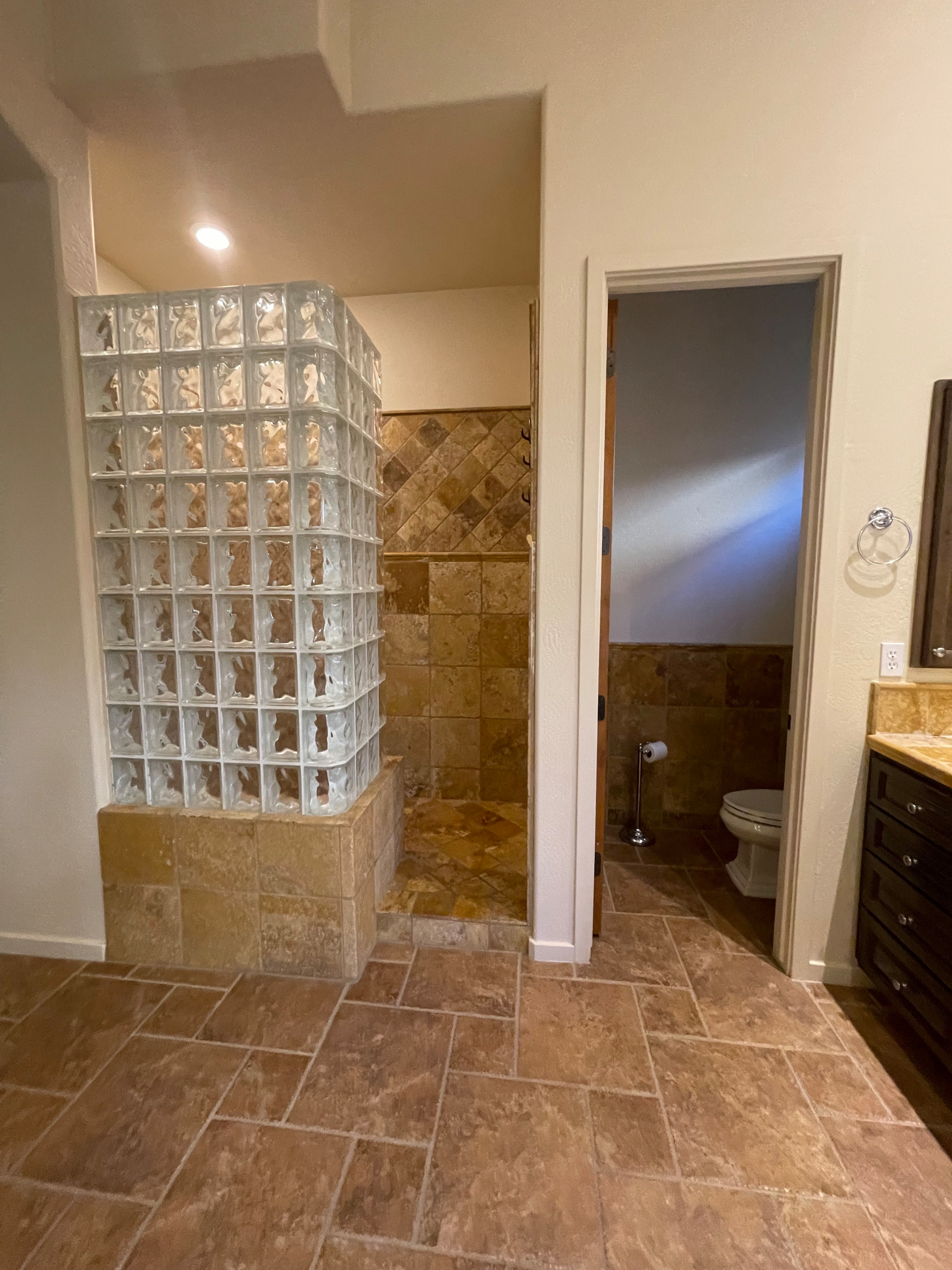 Before: The existing bathroom was weighed down by a large expanse of travertine, a glass-block shower, two vanities placed on opposite walls, a large bathtub surround and a linen closet the homeowners didn’t like. The couple wanted Axt to create an airy, spa-like retreat with a lot of storage.