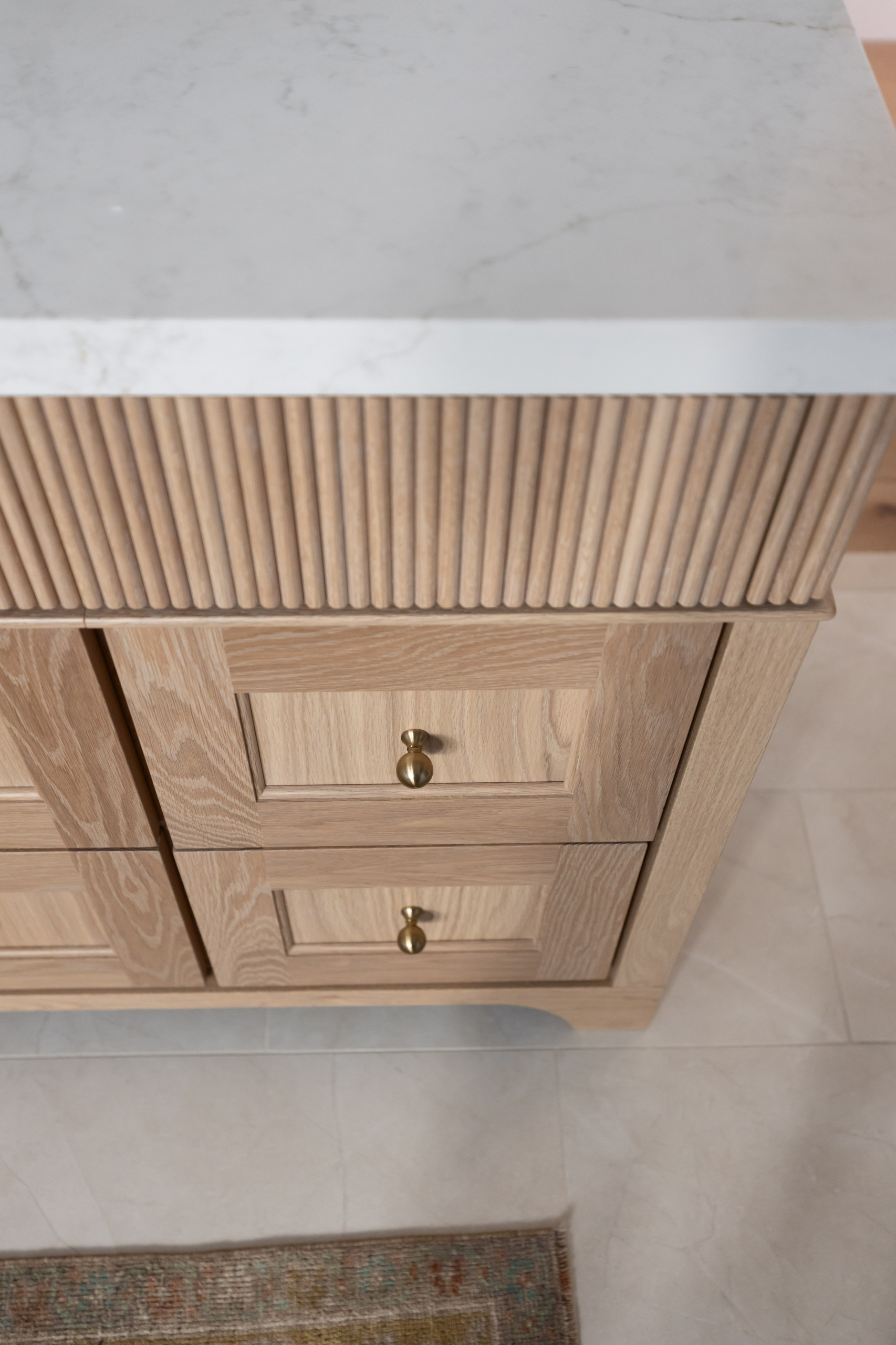 A fluted detail along the top of the vanity conceals hidden charging drawers that open with a gentle touch. The mix of fluting and Shaker-style drawer profiles creates a refined look without appearing busy.