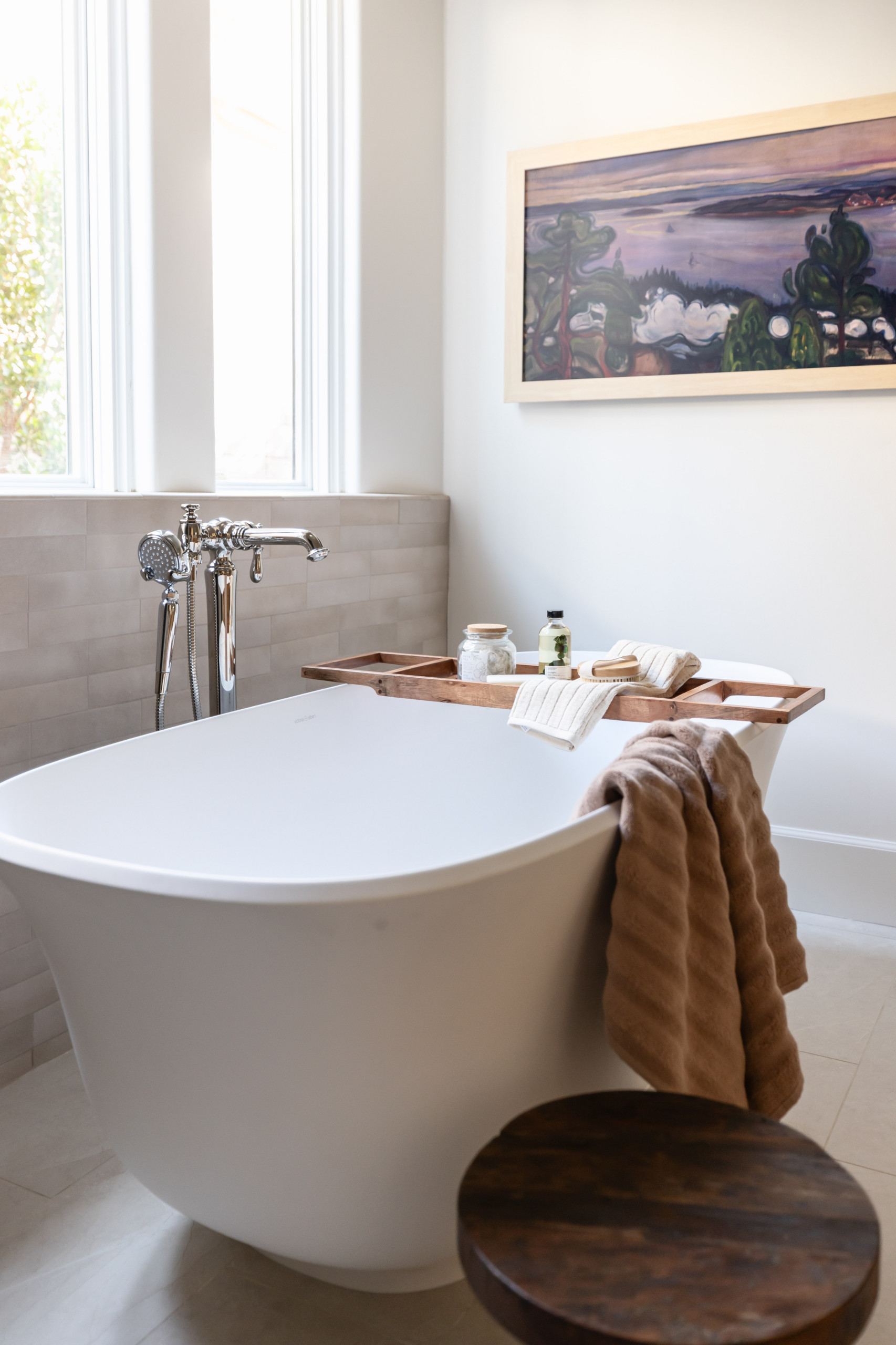 Light, warm tones define the palette. For the floor, Axt proposed a large-format (12-by-24-inch) porcelain tile with subtle marble-like veining. The wall tile behind the bathtub has a handmade zellige look and picks up the tones in the flooring. Together, the tile choices enhance the European feel.