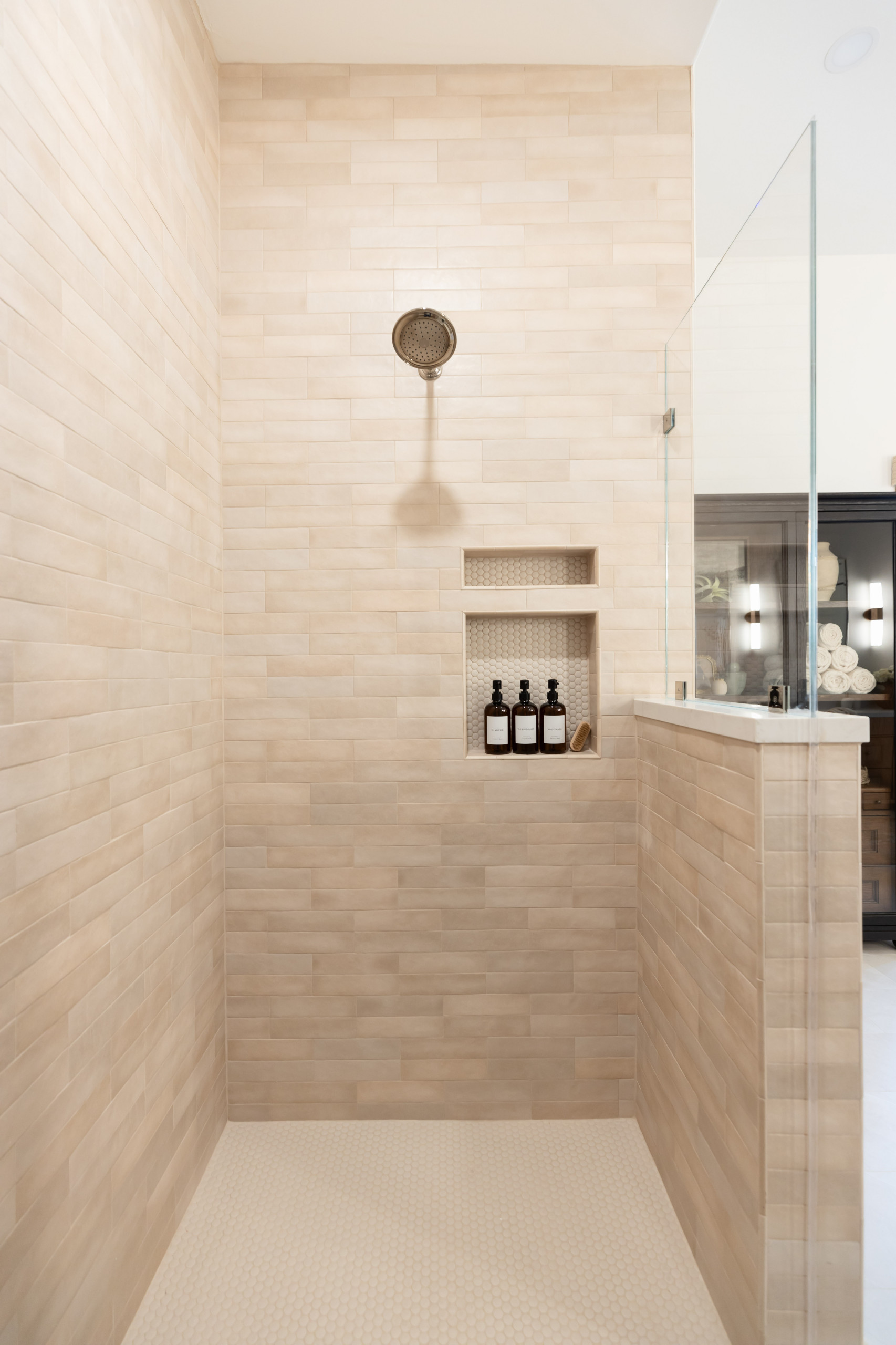 The penny rounds on the shower floor are from the same tile collection as the wall tile. The quartz on the shower bench seat, threshold and pony wall cap matches the quartz on the vanity countertop and helps tie the room together visually.