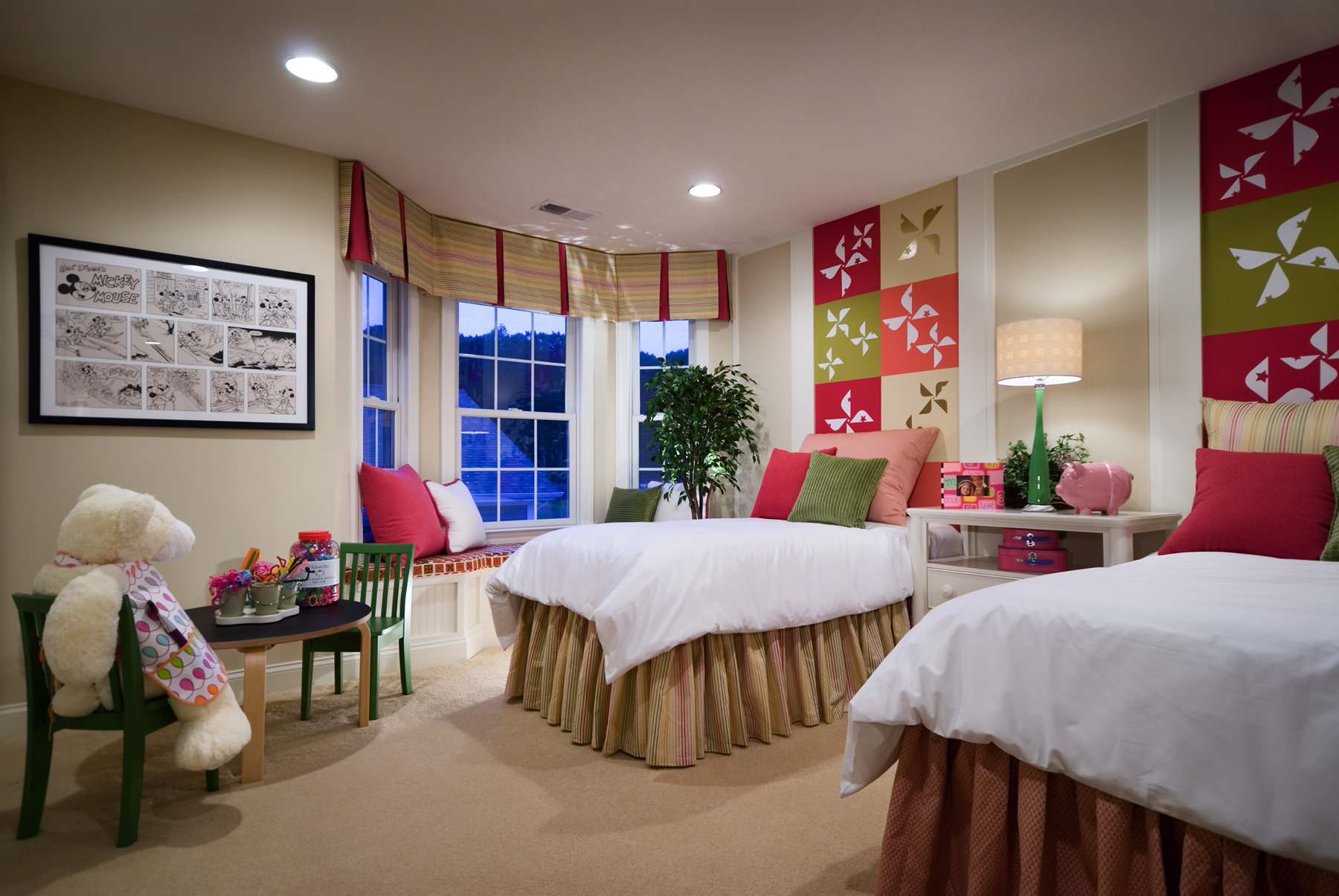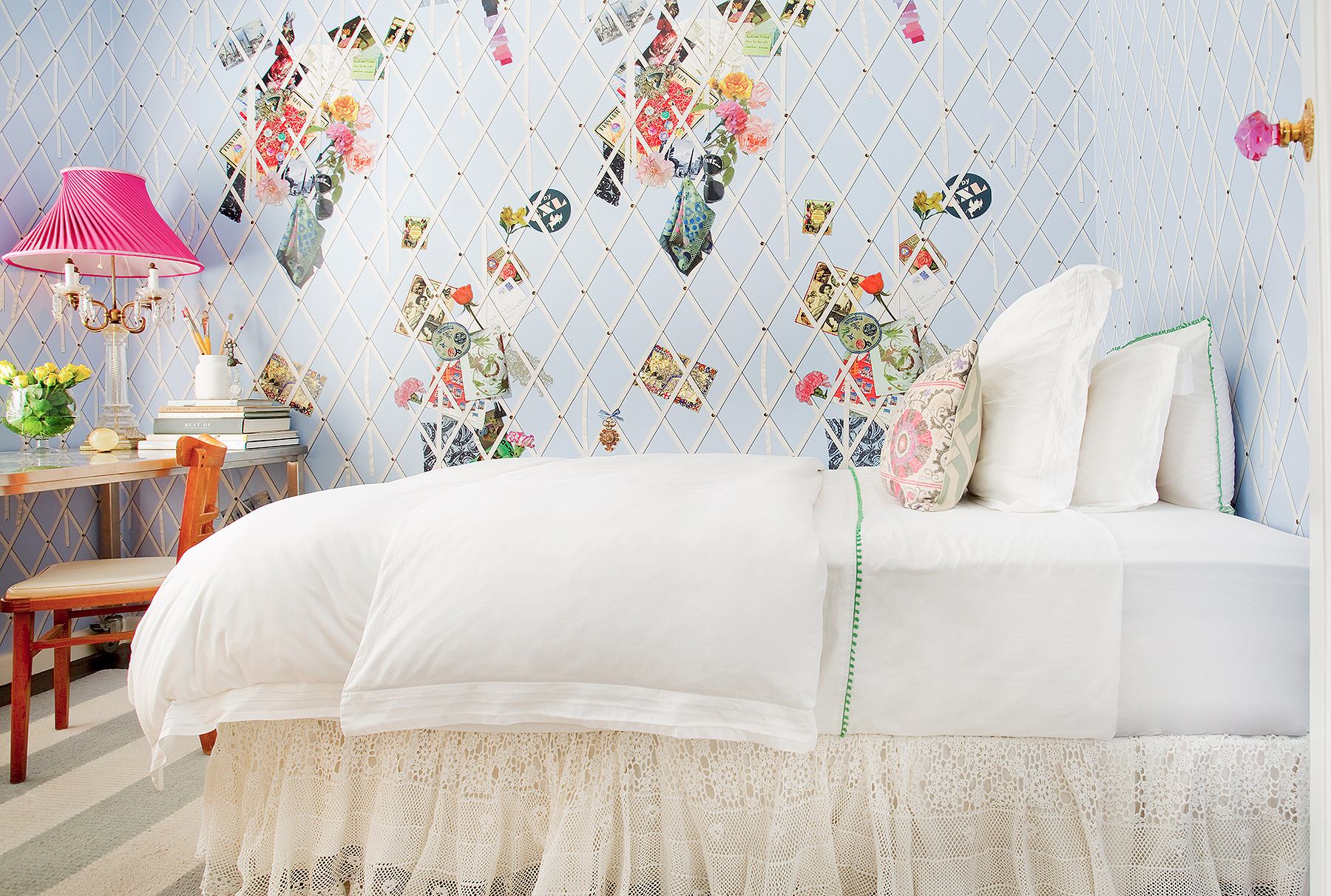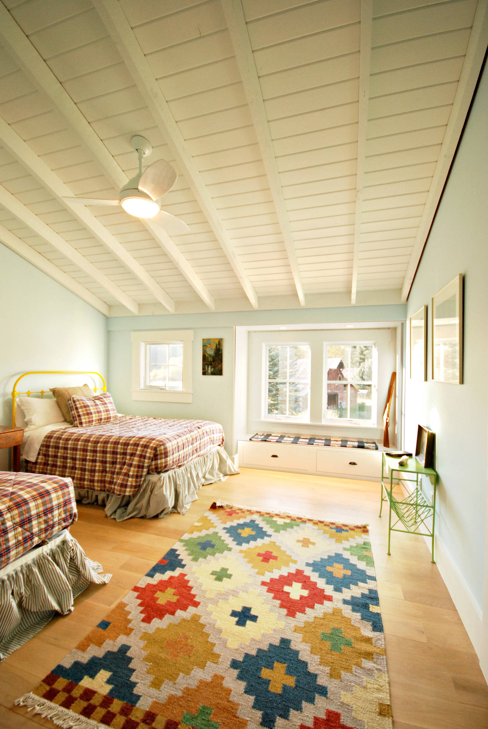 Here, a separate fabric was chosen for the two beds, giving each its own personality in a room with a tight color palette: One wears a stripe, the other a small-scale print. Both patterns are customary choices for bed skirts, since smaller prints and solids are the easiest to style around.