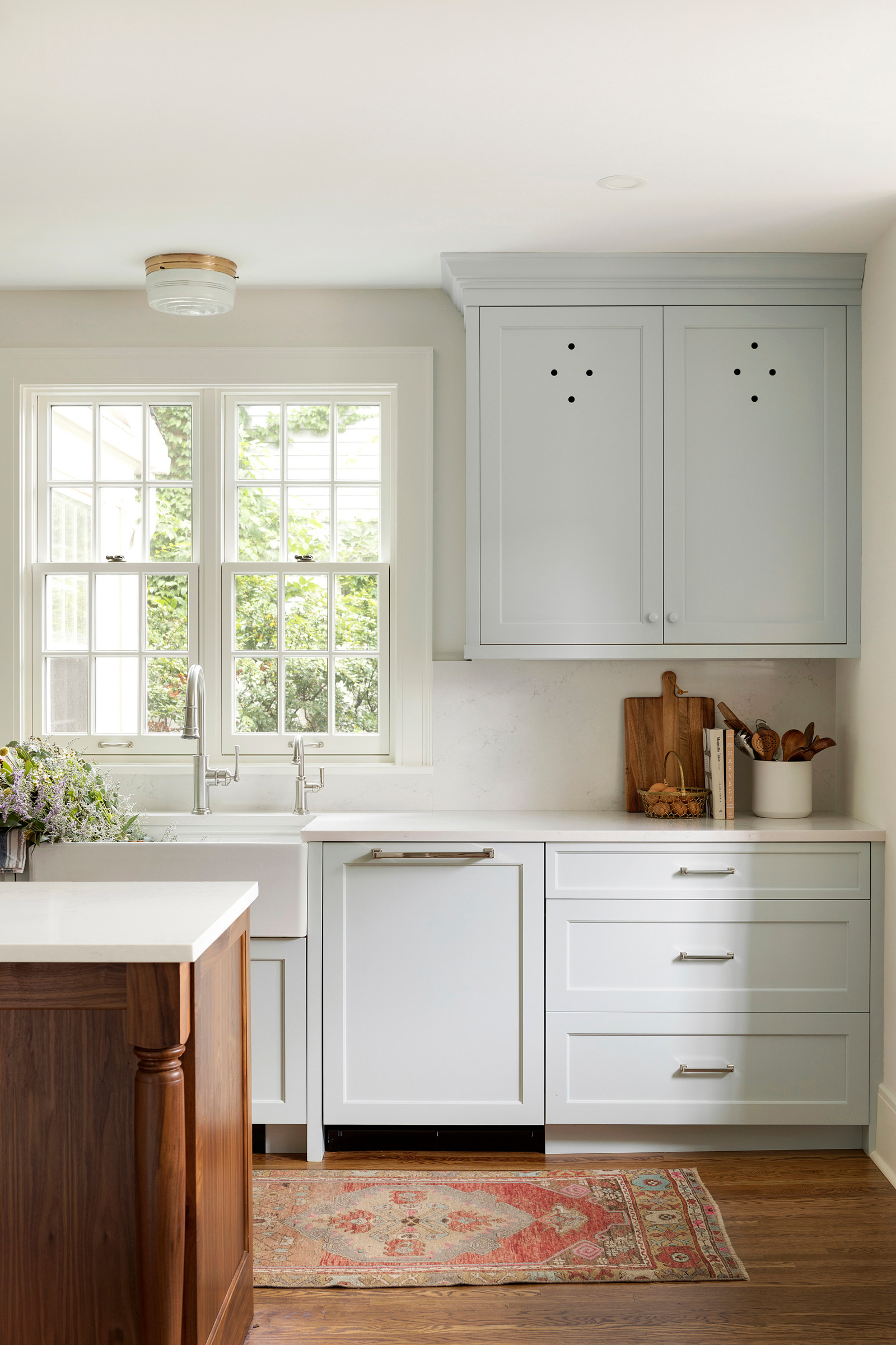 For a style that fit the home’s architecture, she borrowed design details from older English and American kitchens. For example, in the door fronts of the new kitchen cabinetry (which were custom-designed and built in the Jkath cabinet shop), Wick added diamond-shaped ventilation holes. She painted the perimeter cabinets Woodlawn Blue from Benjamin Moore’s Historical Colors collection.