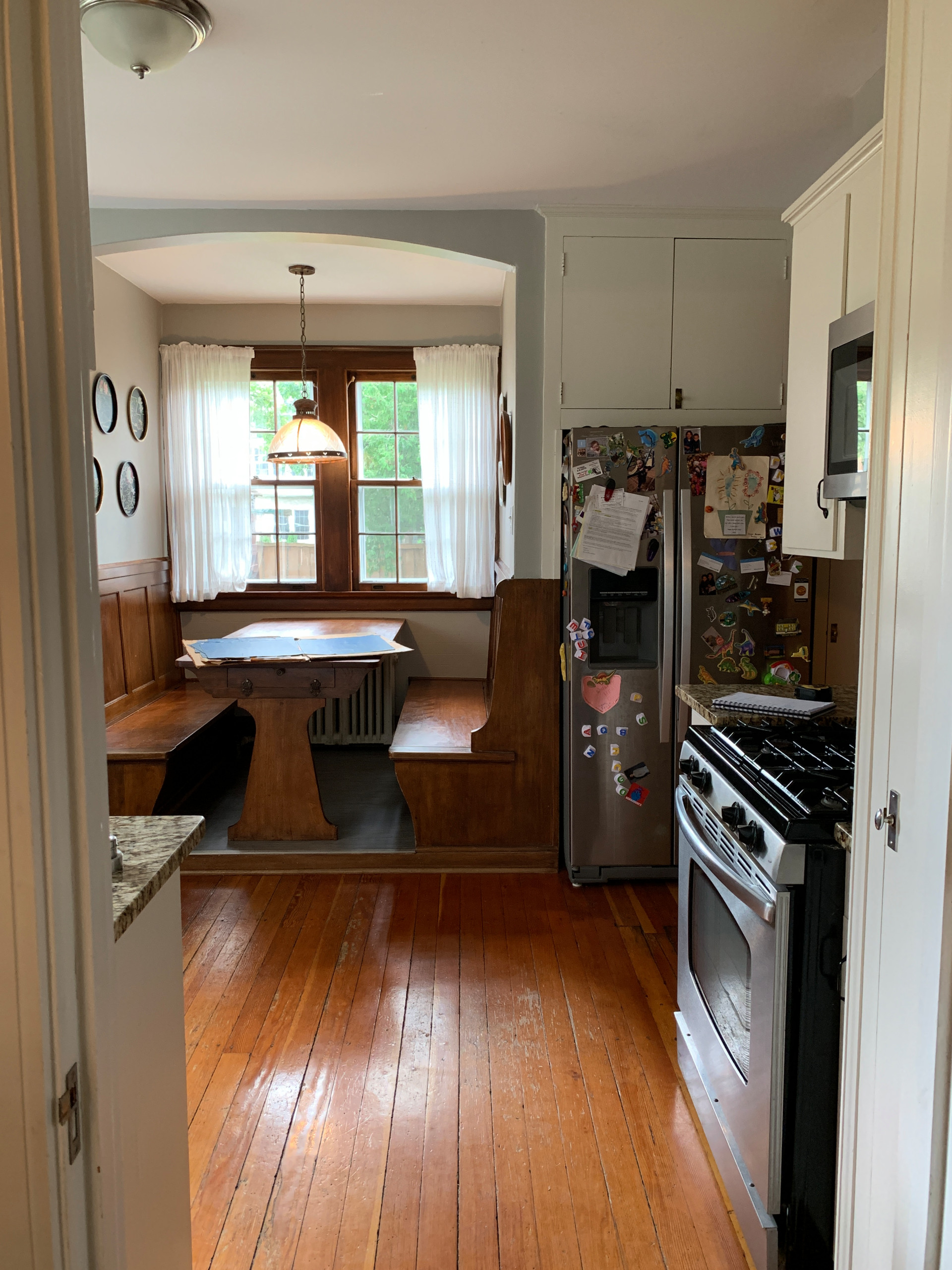 Before: This existing kitchen in a 1922 Minnesota home had been updated but didn’t reflect the architecture’s Colonial Revival style. Plus, a dining booth stuck out into the room a bit, making the poorly laid-out space feel even further cramped.