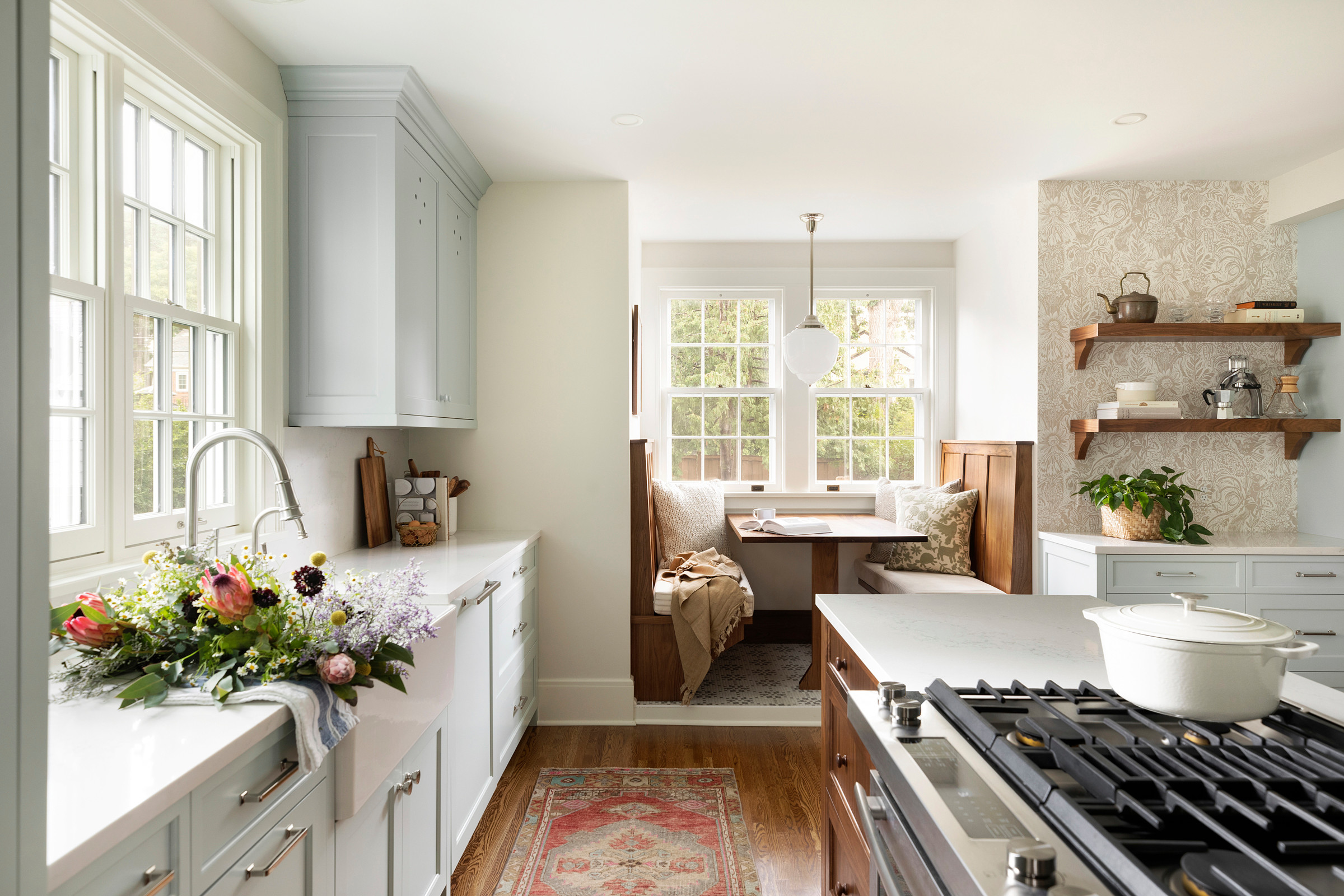 The walnut island’s turned legs — another nod to tradition — were inspired by the spindles of a nearby staircase.