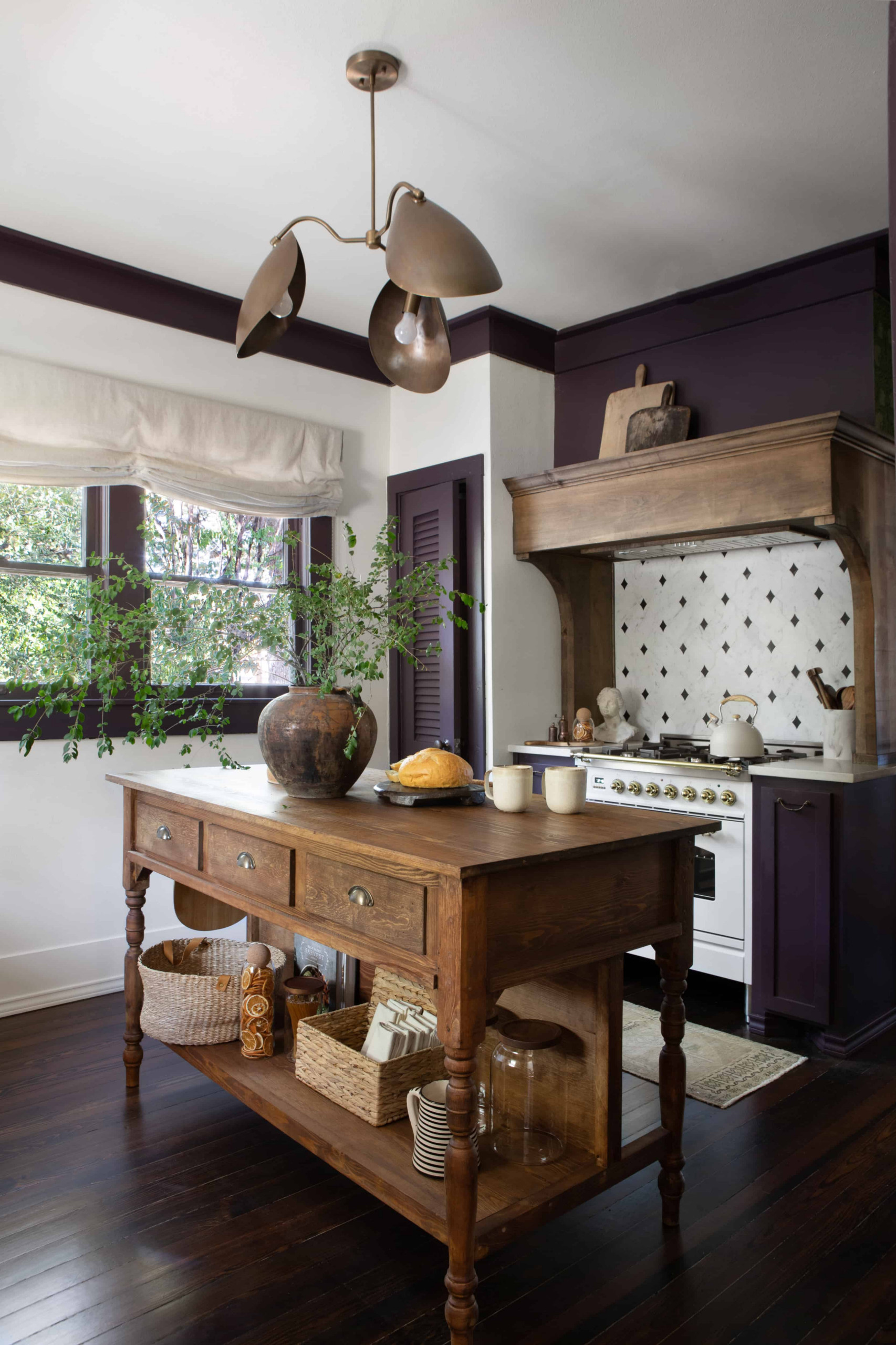 The island looks like an antique, but it was actually designed by Curtis after she couldn’t find a vintage piece in the right scale. She then designed the custom range hood to play off the island.