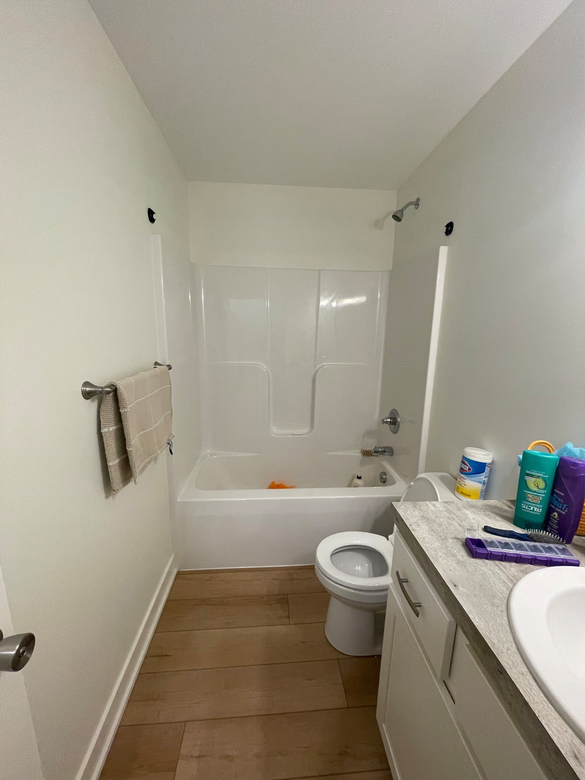 Before: In preparation for having her mom move into their updated in-law suite, this homeowner and her husband set out to make the basic and boring 45-square-foot bathroom with white fiberglass shower-tub insert and wood-look vinyl flooring something Mom would be proud to use.