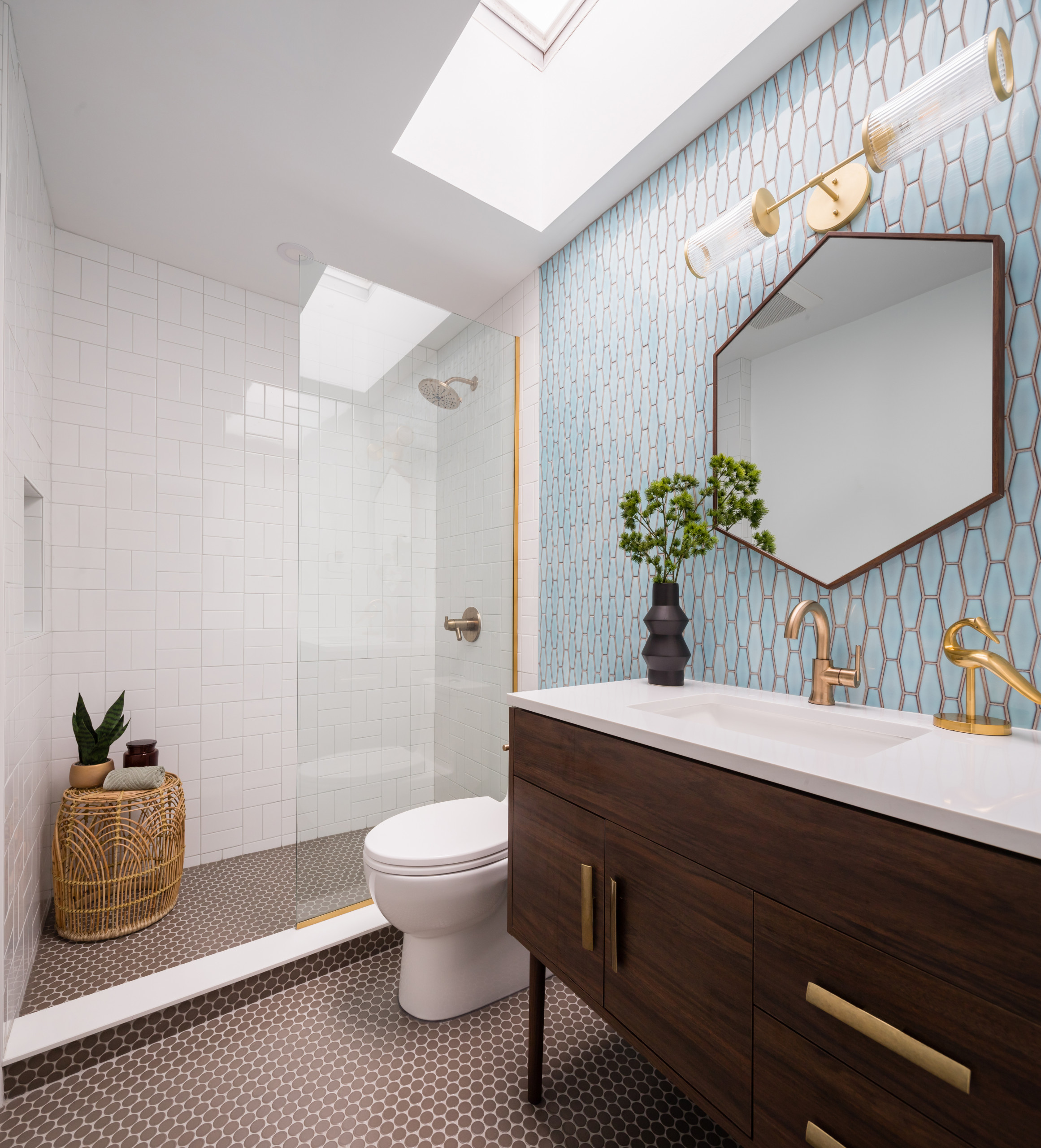 After: Beautiful blue elongated hexagonal tile on the wall behind the new vanity provided a jumping-off point for the design. The homeowner found the vanity at a big-box store, and the brass hardware, thin legs and midcentury-inspired style were a perfect fit for the Palm Springs-inspired space. White shower tiles in a basketweave pattern help reflect and enhance light.