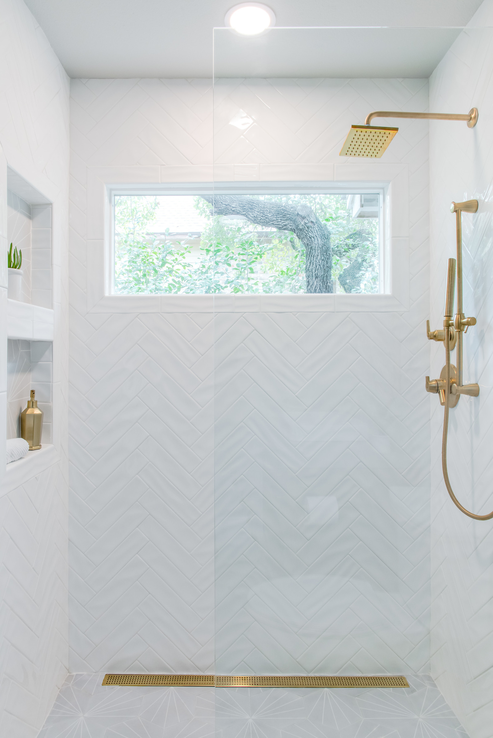 Handcrafted glazed white ceramic tile installed in a herringbone pattern adds visual texture and enhances light. The flooring in both the shower and main area is handmade encaustic cement tile in a gray-tone geometric pattern. A clear clerestory window inside the shower lets in natural light and captures views of the majestic live oaks outside.