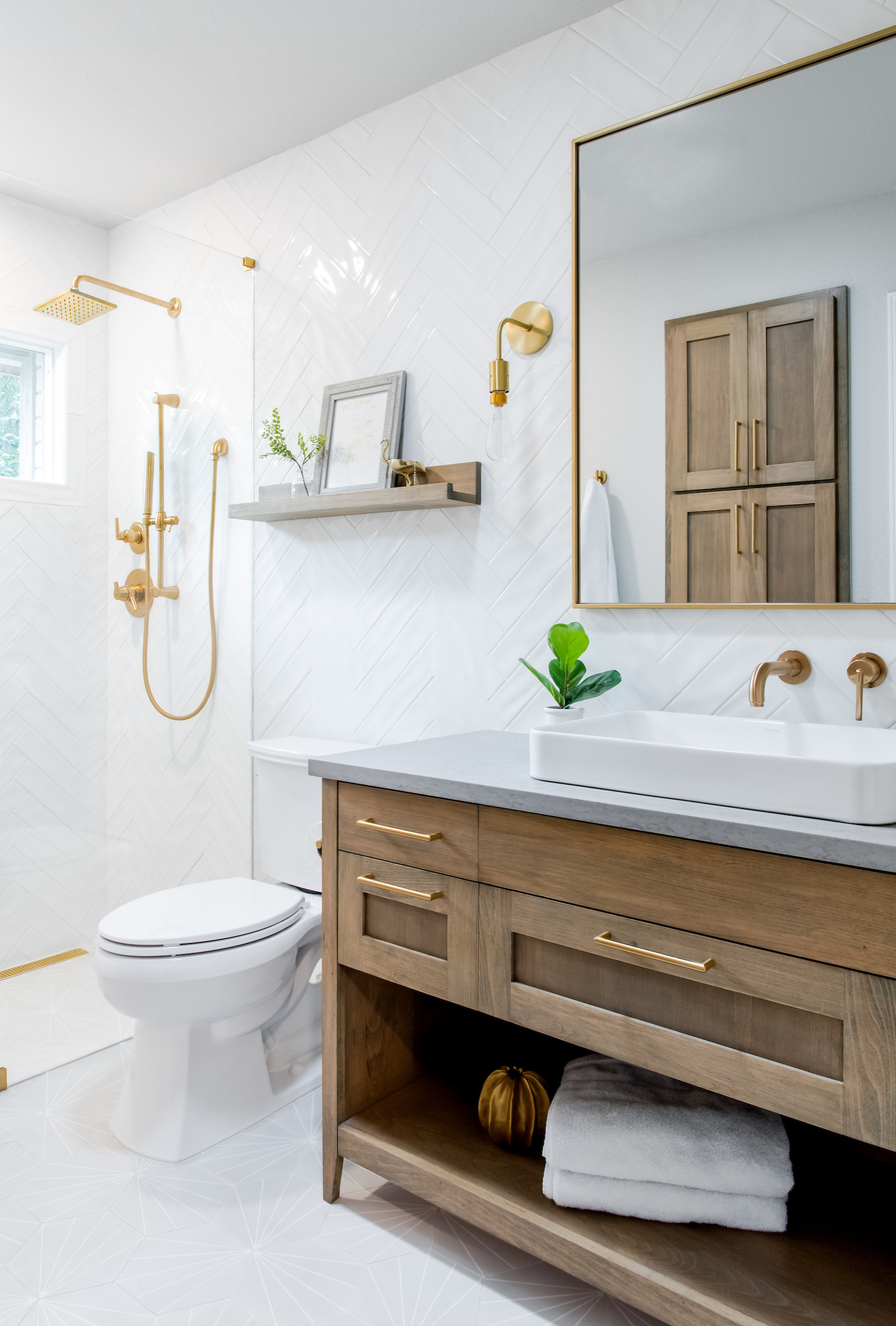 The white tile extends behind the vanity wall. Brass details and a new wood vanity and linen tower across from it (seen in the mirror reflection) add warmth.