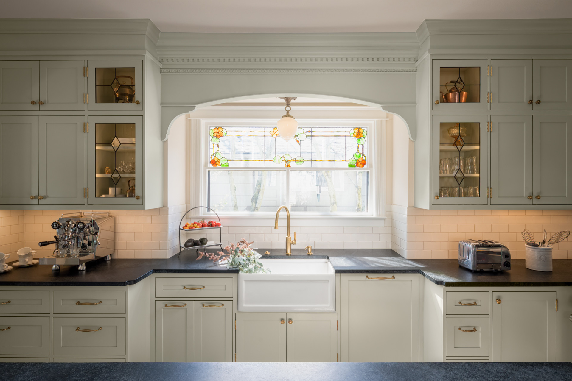 After: Wright Sentz highlighted the deep-set stained-glass window seen here, original to the home, by adding an arch and dentil molding. Leaded glass cabinet doors fabricated by a local craftsperson play off the window and enhance the quaint feel. The sink and faucet mix old and new, with classic materials but updated details.