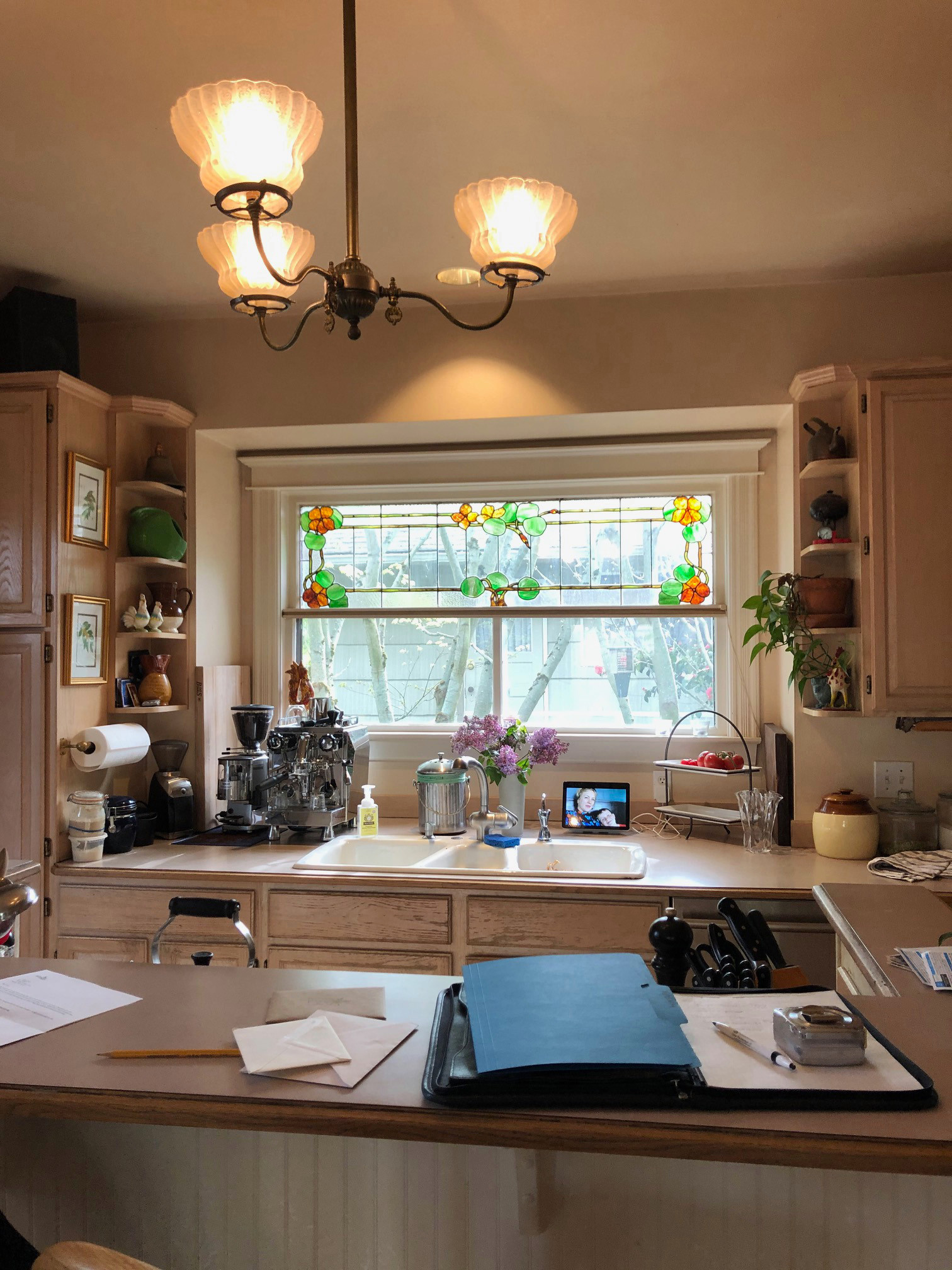 The designer kept as much of the original trim and moldings as possible, having local craftsman Dale Peel match them as needed, and added a pretty botanical wallpaper that complements the jolly blue-green and warm beige millwork. A charcoal gray farm sink with an unlacquered brass bridge faucet feels perfectly on point, and pendant lights with scalloped white-and-gold shades add another nostalgic note.