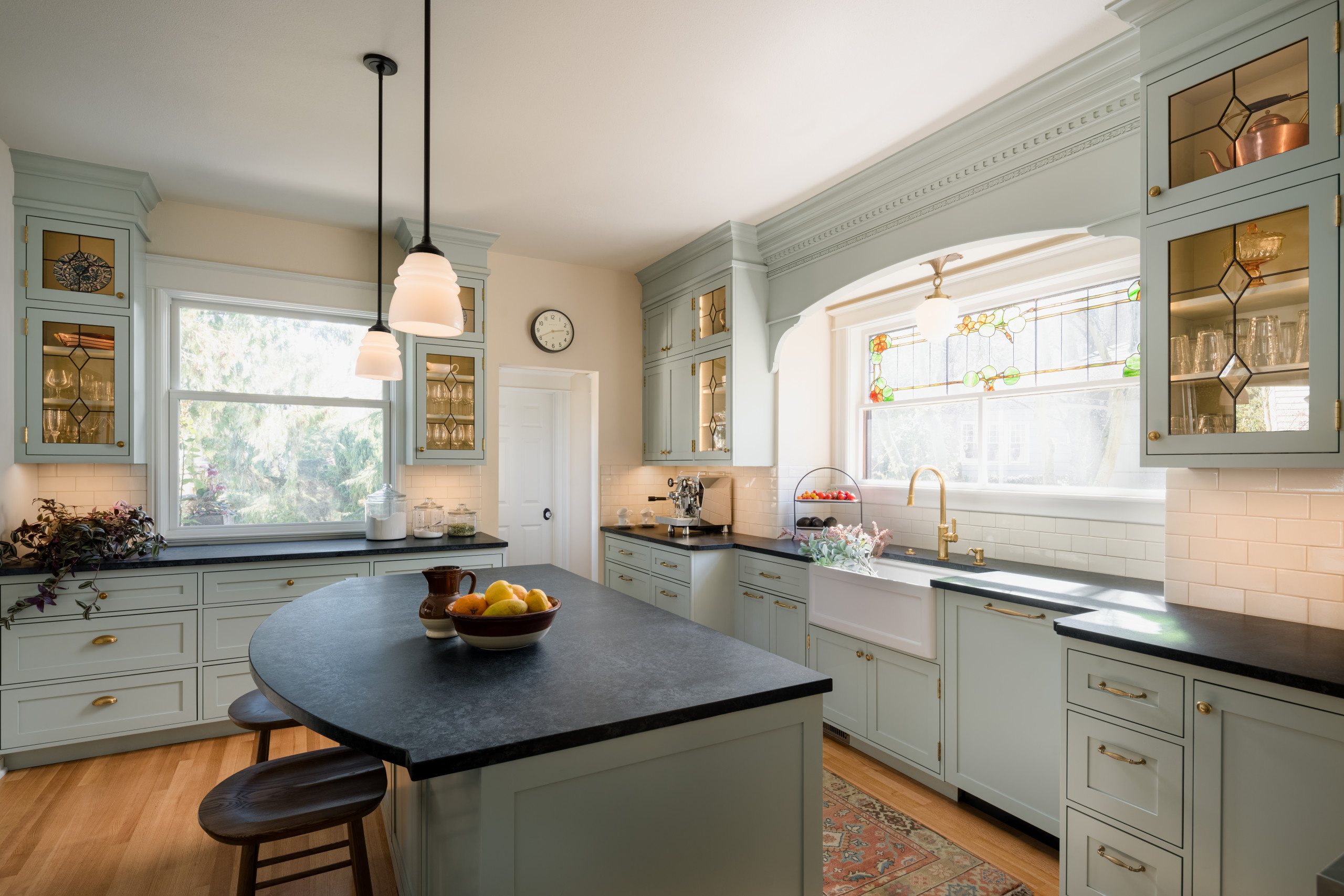 The new cabinets, painted a soft greenish gray, act as a cozy base for dark countertops in soapstone — a popular material in Early American kitchens. The plumbing fixtures and cabinet hardware are unlacquered brass, which will patinate over time. Pendant lights with white glass vintage-silhouette shades and black rods, along with white subway backsplash tile, nod to the past as well.