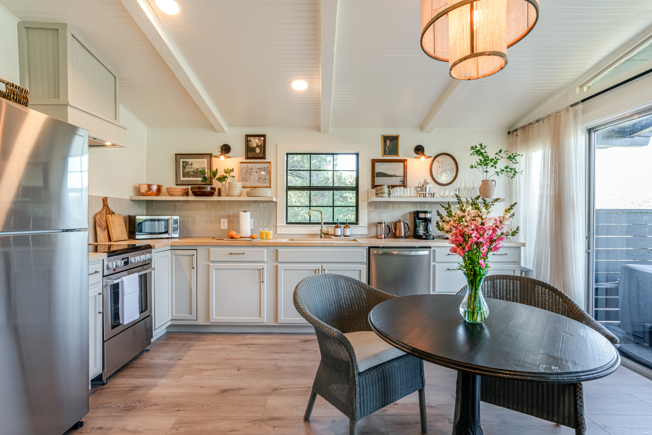 After: Lowry opened the kitchen to the family room, carving out a cozy two-person dining spot topped with a striking light fixture of brass bands and netted fibers. A soft, neutral palette keeps the focus on the stunning views. Walls, ceiling and trim are a warm off-white (Oyster White by Sherwin-Williams). Painted beadboard now covers the former popcorn ceiling.