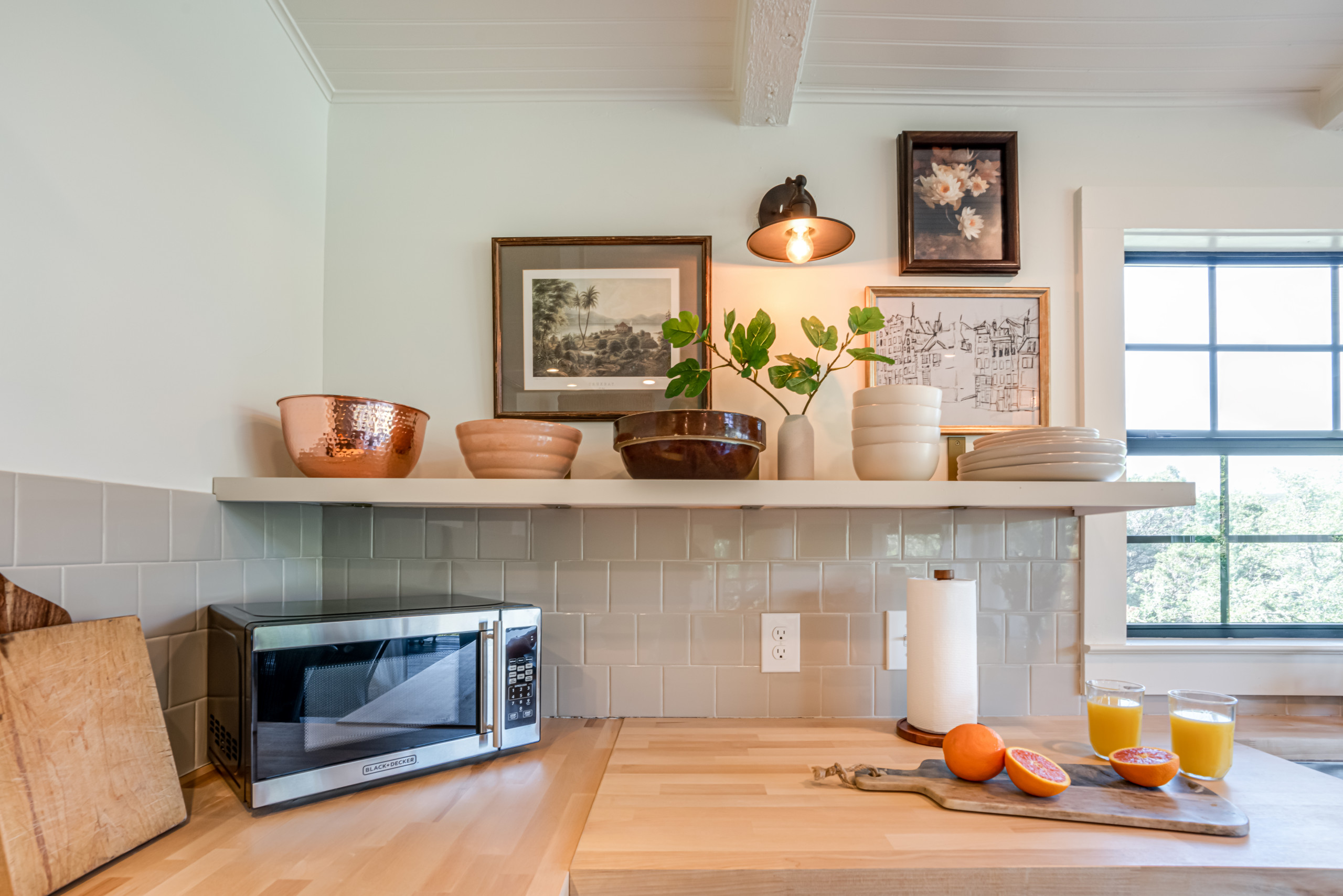With the kitchen now fully in view of the family room, it needed to look as good as it functioned. Lowry embraced open shelving to work with the angled ceiling and make everyday dishes and glassware easy to grab. She layered in vintage ceramics and art for personality and charm.