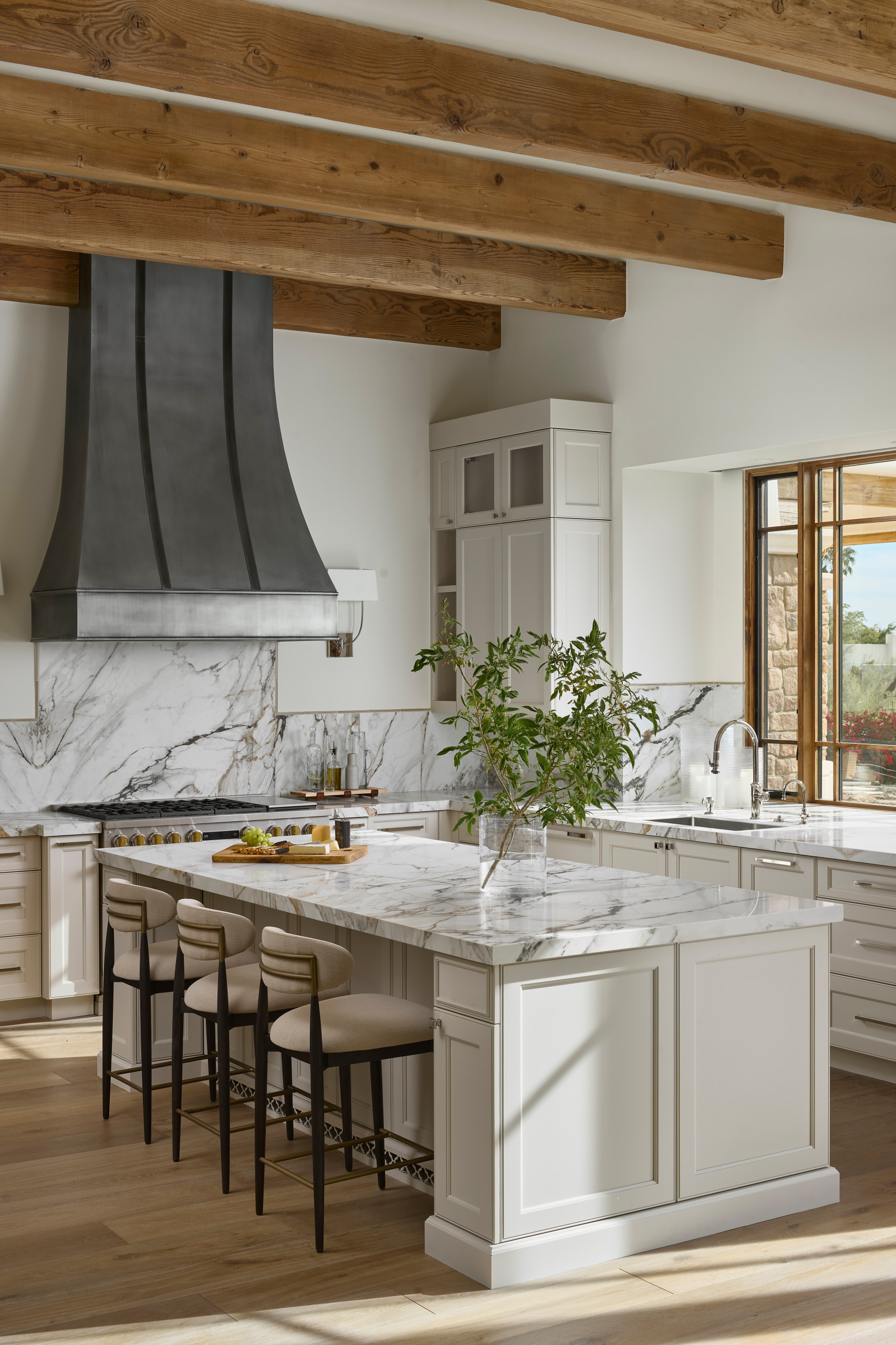 After: At 9½ by 4¼ feet, the island fits three stools and has touch-latch cabinets in the knee space as well as storage on the sink side. The boldly veined Neolith Calacatta Luxe porcelain top matches the perimeter countertops, and the base, like the perimeter cabinets, is painted in Benjamin Moore’s Edgecomb Gray. The neutral colors usher the view toward a custom antiqued-zinc hood from one angle, while those sitting at the island can enjoy the backyard vista through a new, larger sink window.