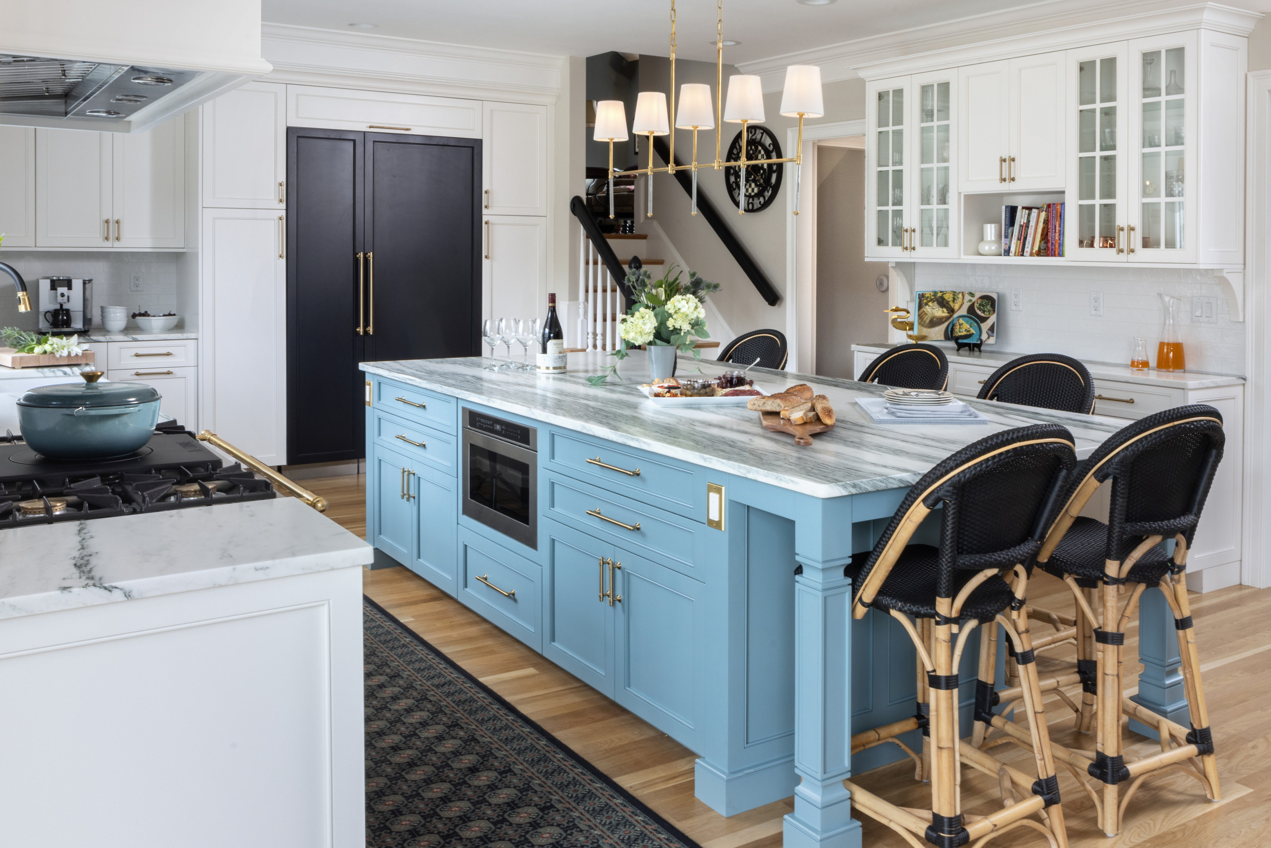 After: Painted a cheery blue (Hemlock by Benjamin Moore), the new, larger island is a lively focal point. Six rattan seats make for stylish perches, and they allowed Swartz to refashion the original adjacent breakfast area as a small fireside lounge.