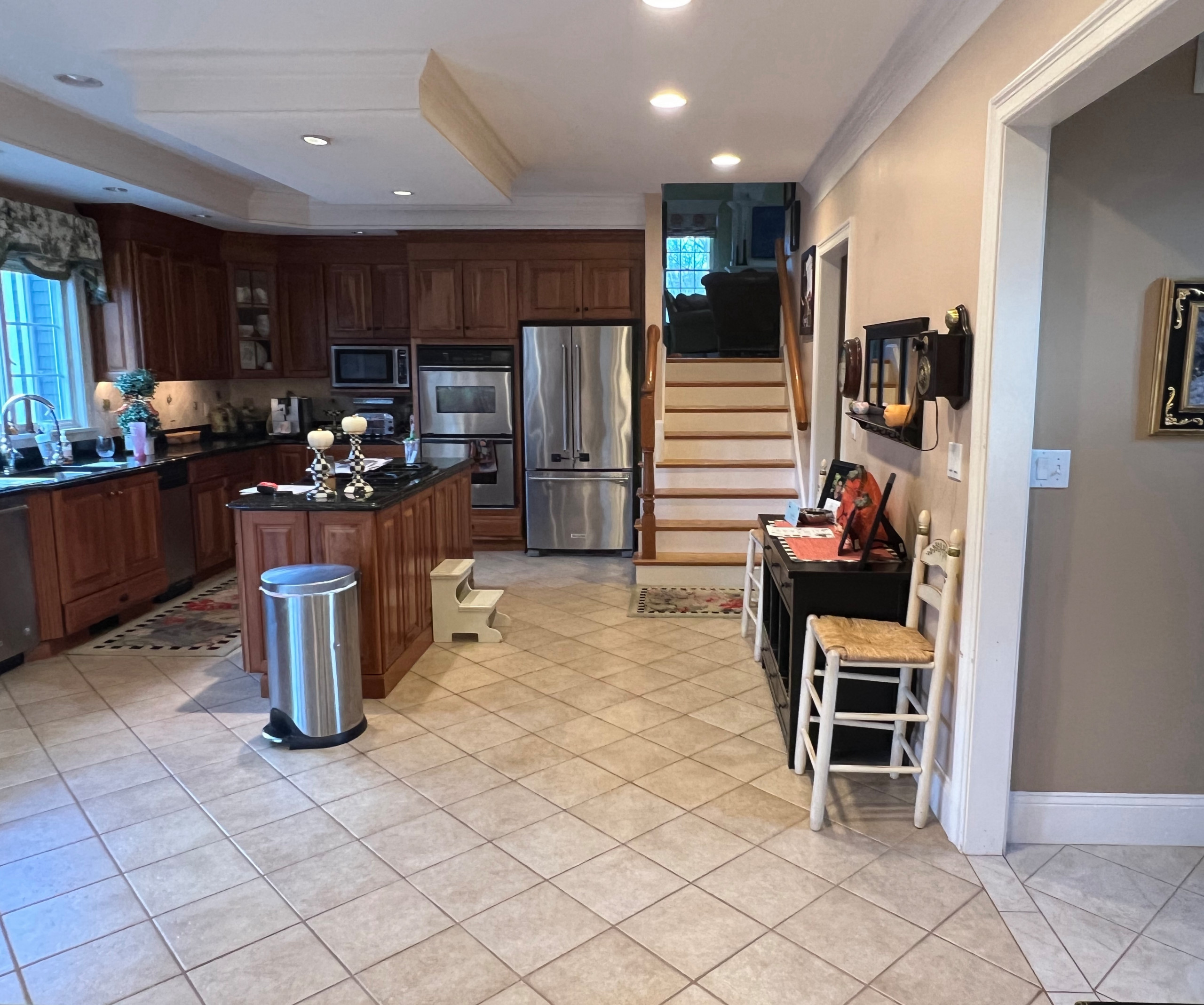 After: McCarthy removed a partition (the fridge wall in the previous photo) and expanded the kitchen into the formal dining room. This added 180 square feet to the kitchen’s footprint and allowed for a generously sized island with seating for six — the new main dining spot. Ivory engineered quartz with gray and taupe veining tops the island’s earthy brown-gray base and contrasts with the stools’ tan performance leather upholstery. The sink side of the island houses a beverage center, a microwave drawer and storage drawers.