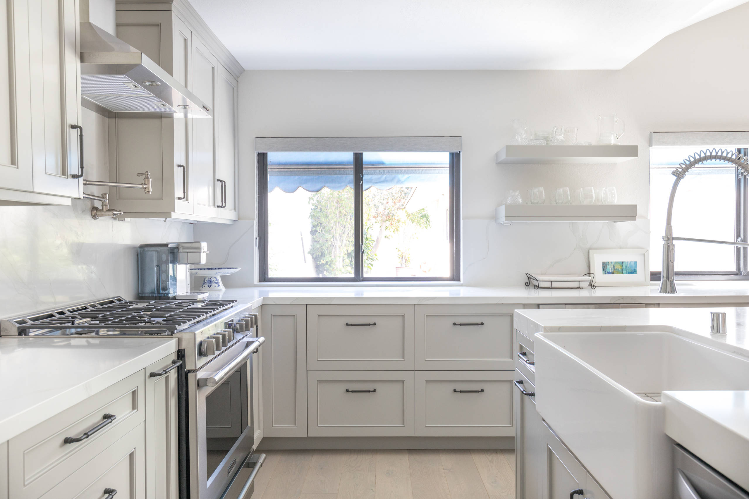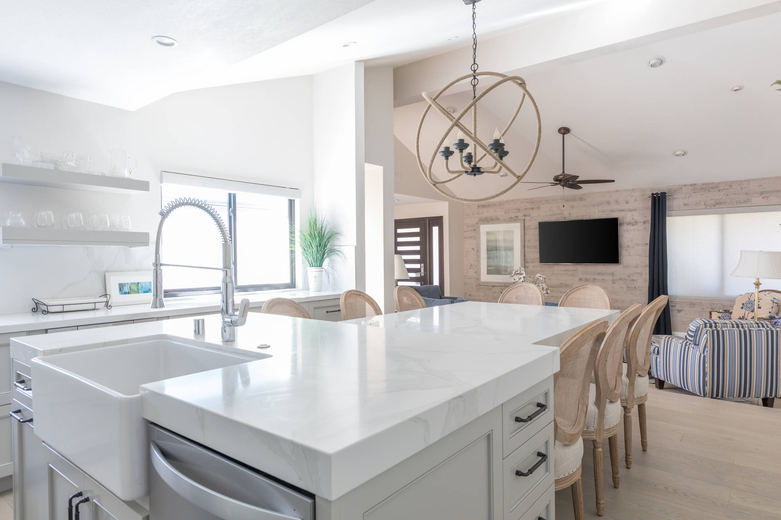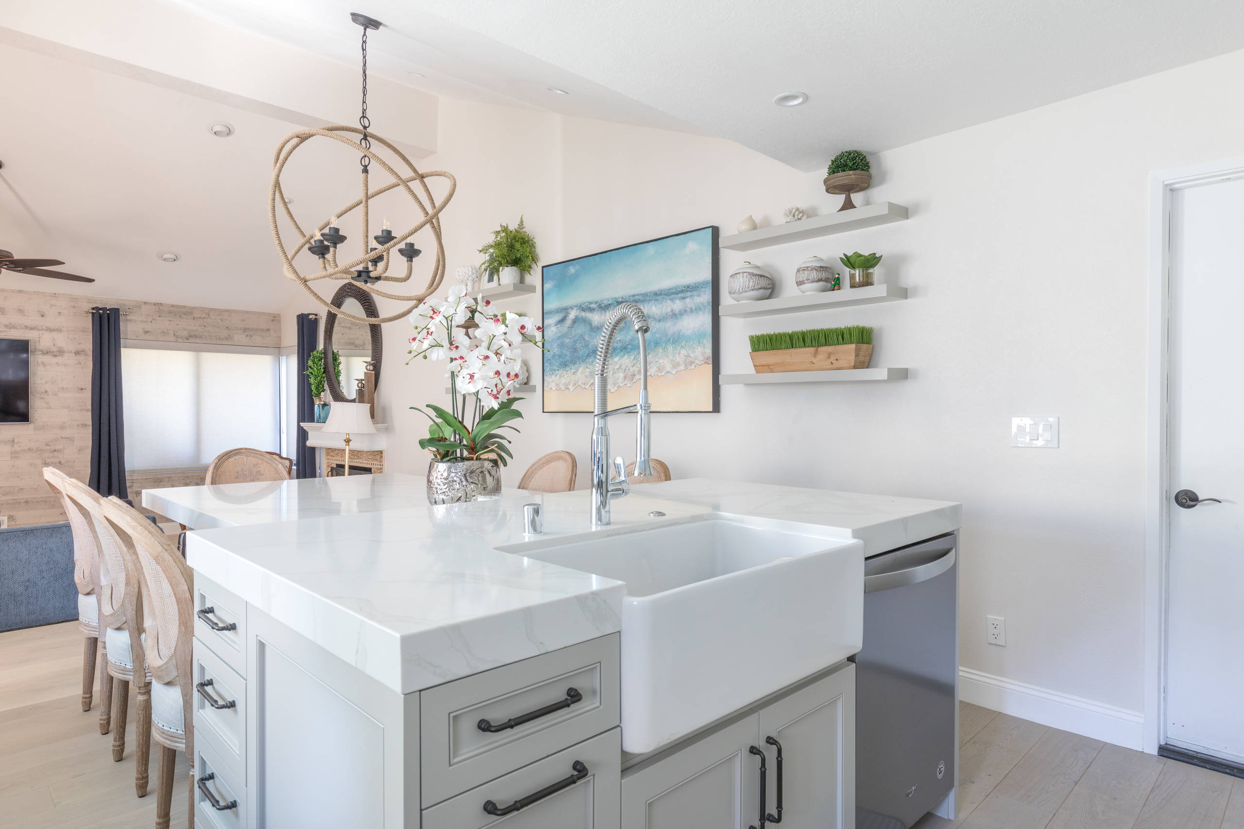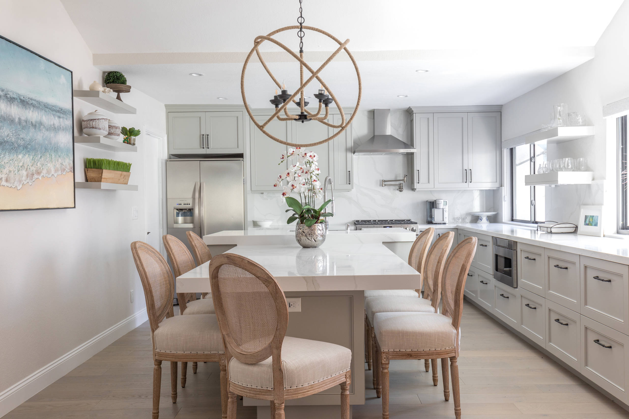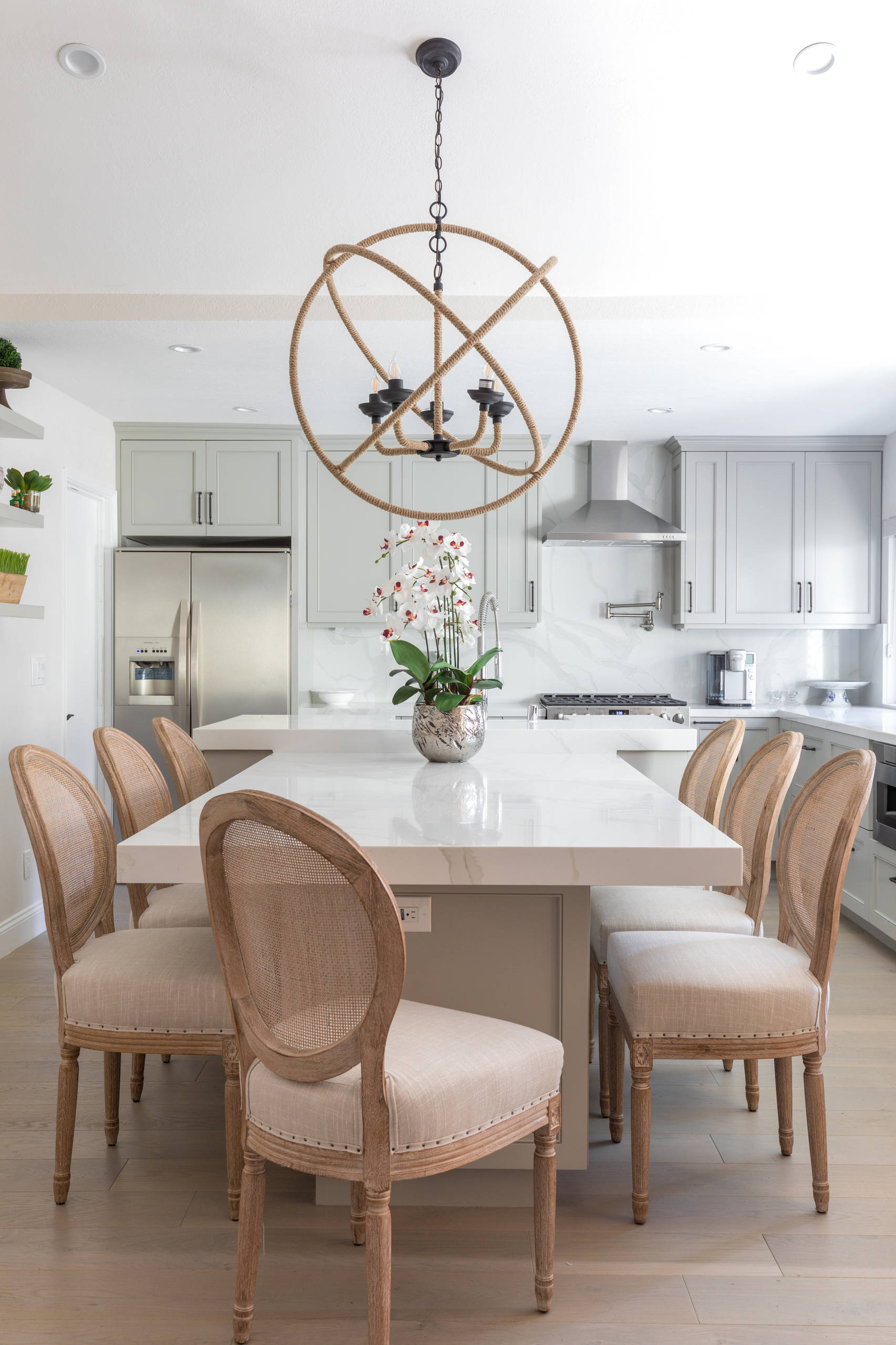The owners of this home in Orange County, California, live in Arizona and were fortunate enough to become owners of this place when it was passed down through their family. They enjoy coming here often for vacations to the beach. The homeowners gave designer Anna Shiwlall of 27 Diamonds Interior Design wide berth to remodel the old kitchen and dining area. “They just said ‘Make it nice,’” Shiwlall says.