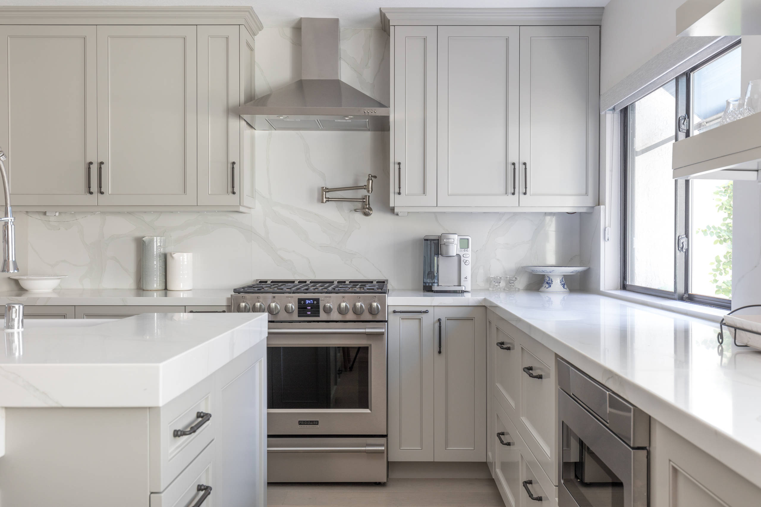Shiwlall chose a Caesarstone slab designed to look like marble for the countertops, dining table and backsplash. “Using one whole slab piece gives a cleaner, more seamless feel,” Shiwlall says. The cabinets are Shaker style and painting them Repose Gray by Sherwin-Williams gave them a contemporary vibe, Shiwlall says.