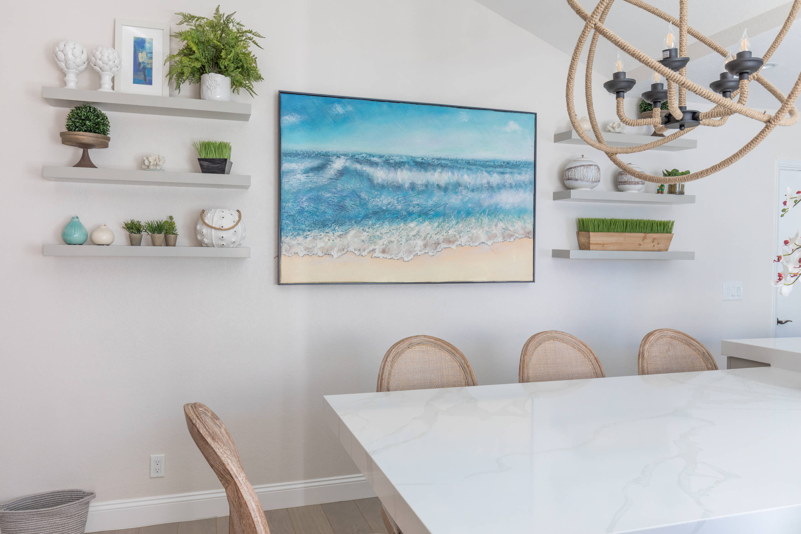 A rope chandelier over the dining table adds the rustic note Shiwlall wanted. The designer selected beachy art and accessories, adding greenery and succulents to give the space life. The chairs are rustic French-style with distressed wood, and their sandy color adds a beachy, transitional feel to the space.