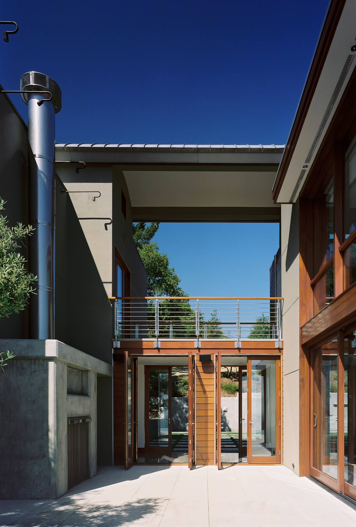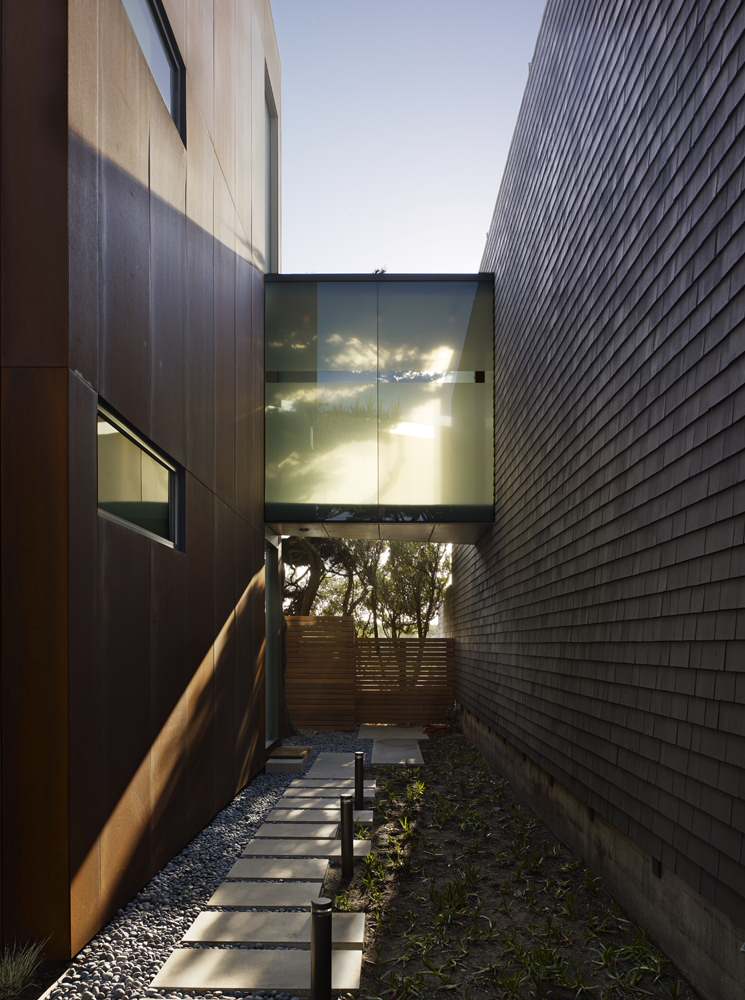 The narrow breezeway in this split-level house provides access to the two halves of the house under a glass canopy. On this top floor (the floor below is a full floor plate, so movement across the halves does not have to happen outside) the breezeway extends to become a balcony.