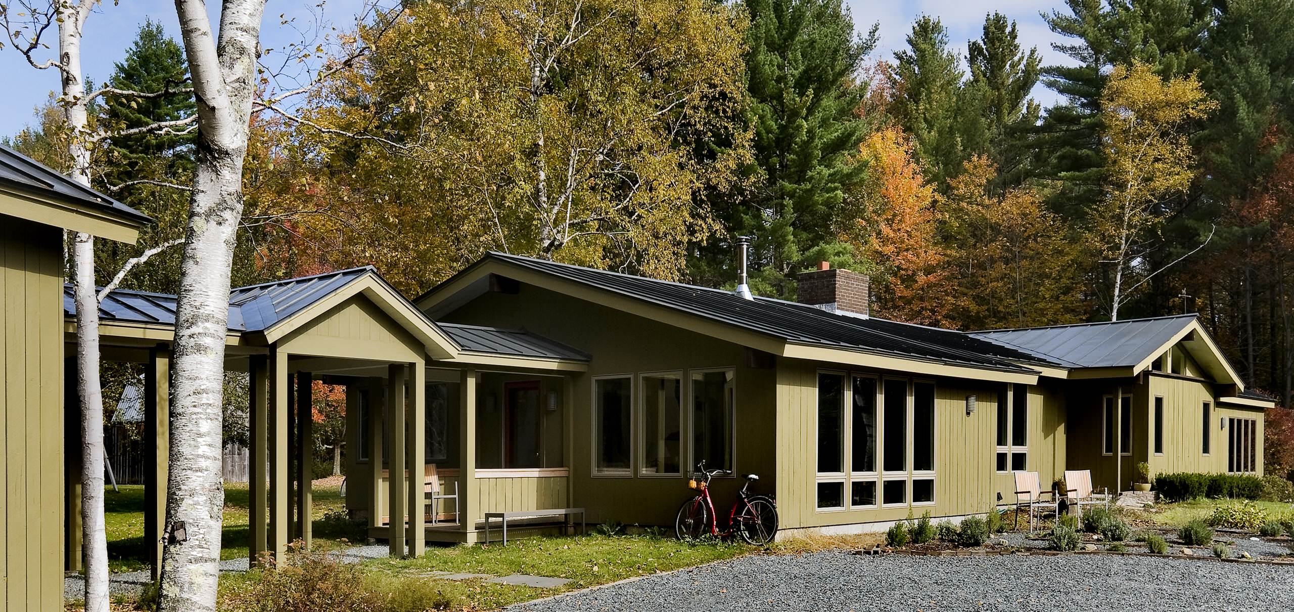 For this 1,400-square-foot house in a wooded context, I'll use a few photos to walk us around the breezeway. From afar this outdoor space is located just off of center, splitting the house into 1/3 and 2/3 volumes.