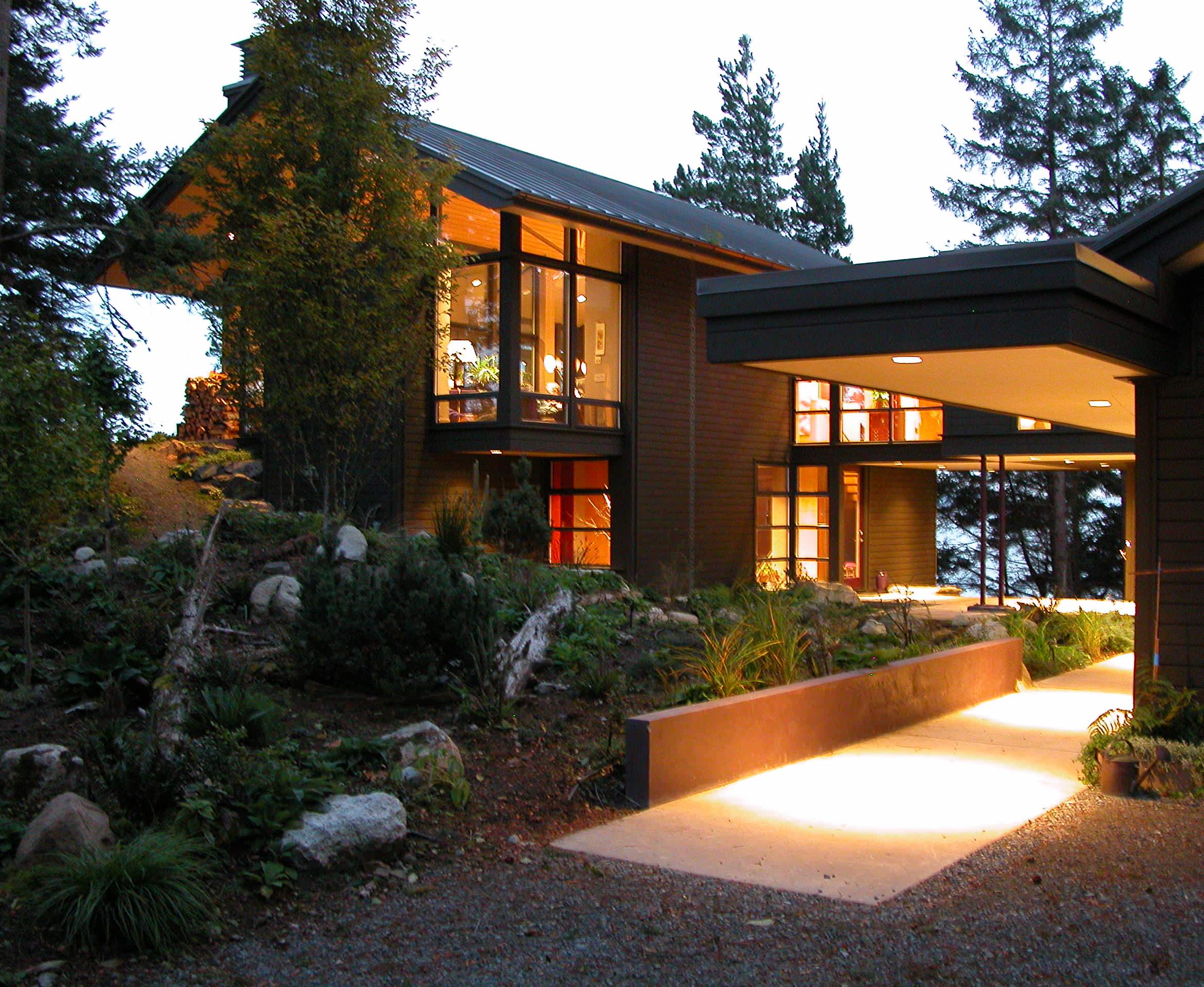 This house, "U"-shaped in plan, situates a landscaped courtyard between the main wings, opening up the middle side as a beezeway. This opening connects the courtyard to the larger forest landscape beyond. A second floor bridge links the house and provides shelter for people outside.