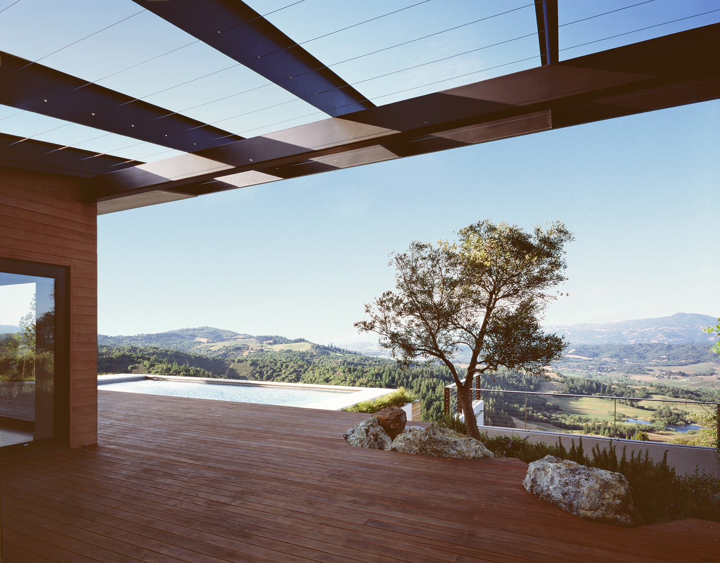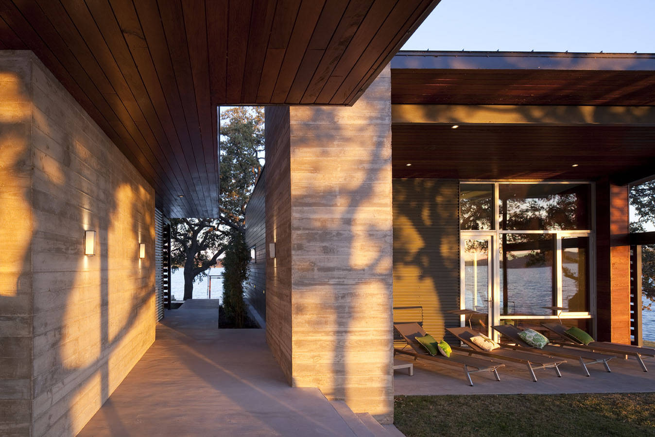 Here the breezeway is an extension of the poll deck. Shelter comes in the form of an overhead trellis, but the space is all about the view.