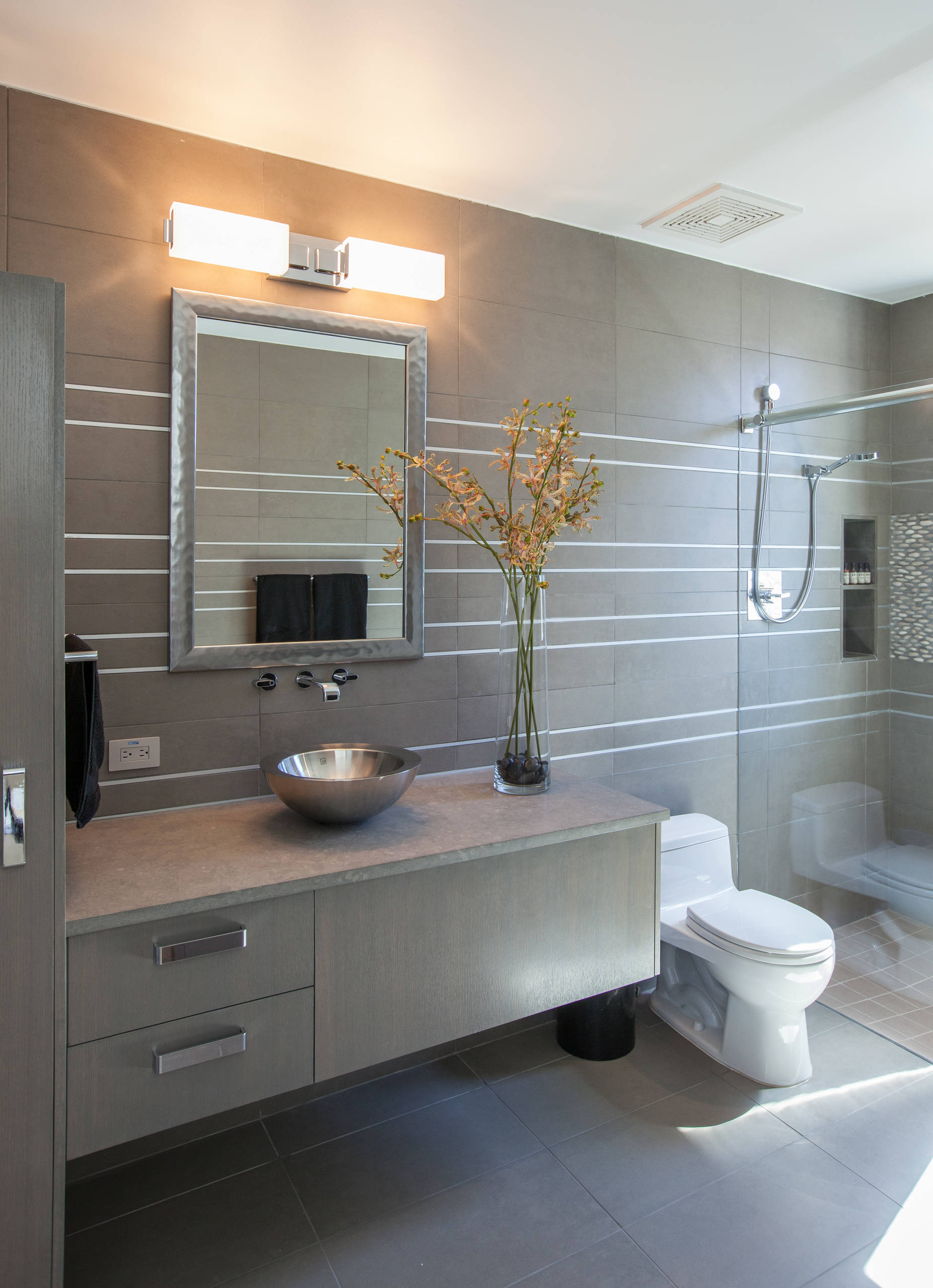 Not ready to commit to a wall of metallic tile? Consider using it as an accent, as shown in this photo. The narrow silver metallic tile subtly enlivens the monochromatic color scheme of this bathroom.