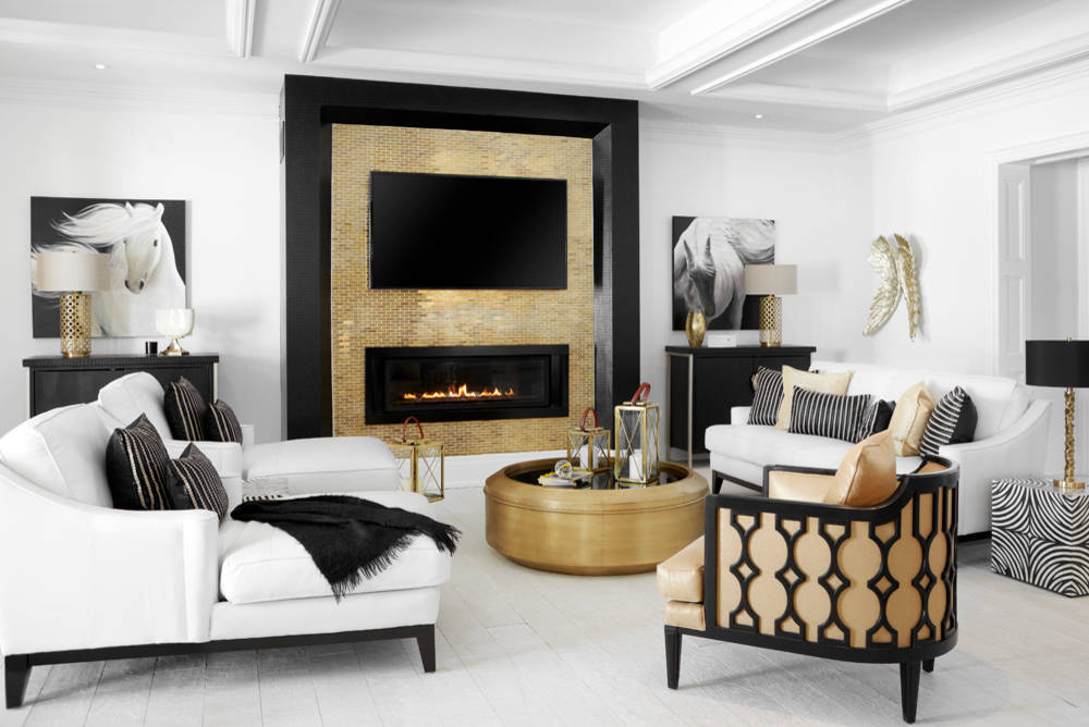 Metallic tiles can add a touch of glamour and opulence to any setting. The golden tones of the metallic tiled fireplace are highlighted by its black surround in this sleek and modern living room. Gold accessories complement and complete this look.