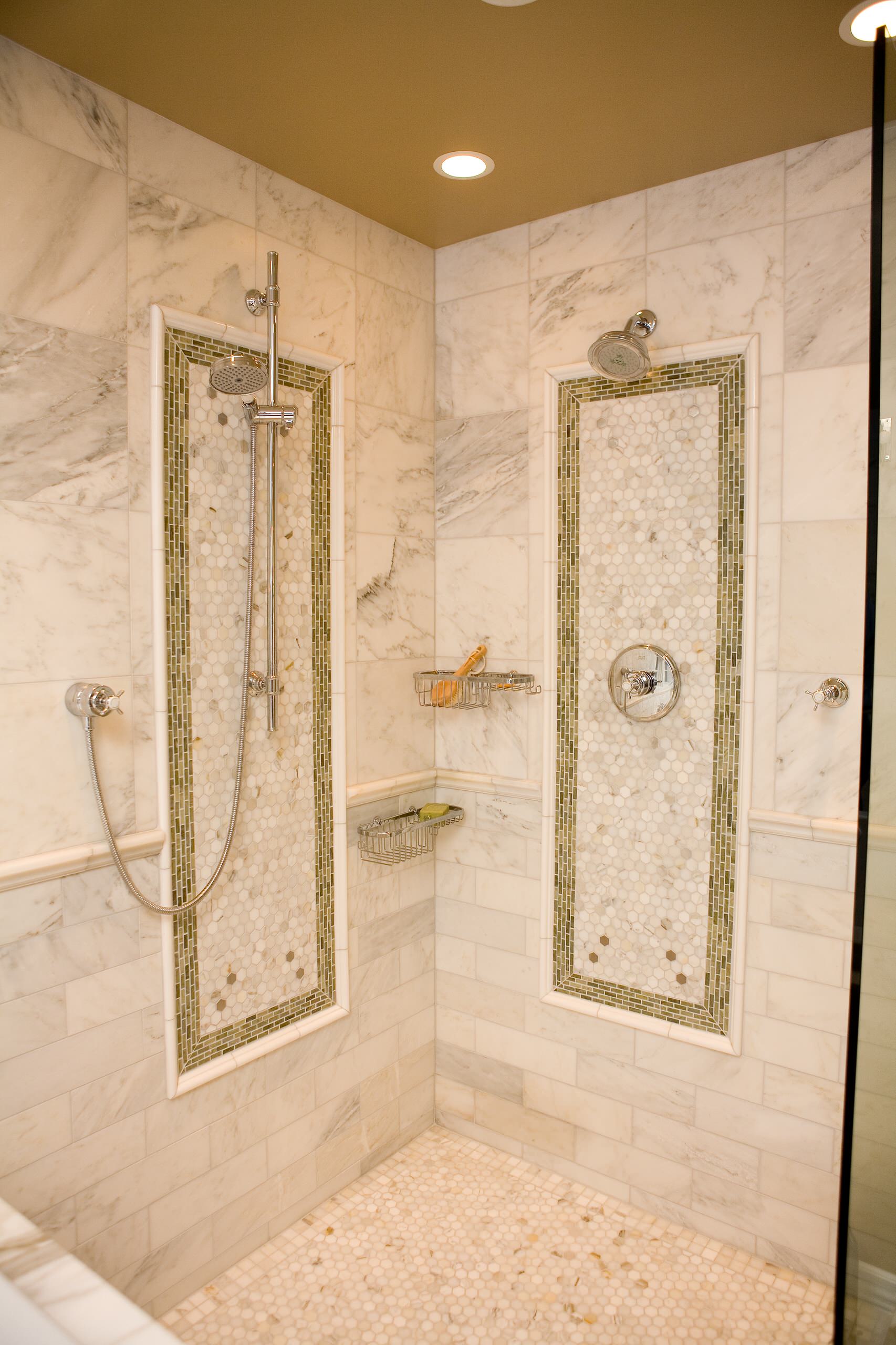 This photo shows another example of mixing metallic tile with stone. The sophisticated elegance of this marble shower is elevated with a touch of bling via gold metallic accents.