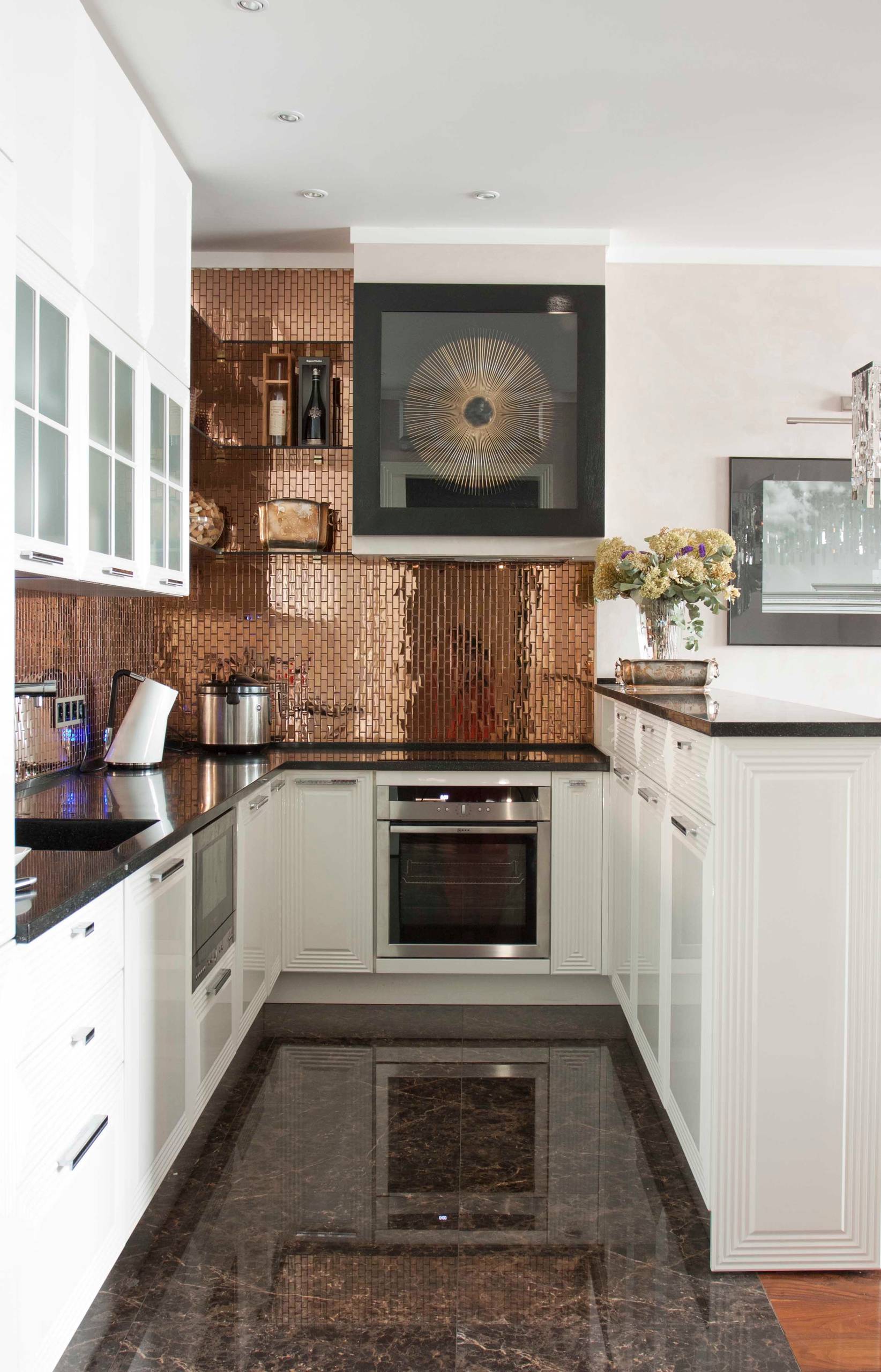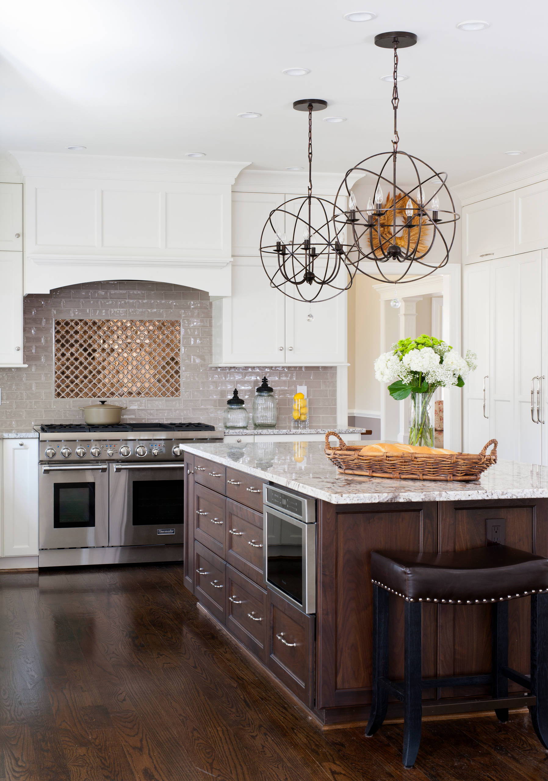 Once seemingly relegated to modern applications, metallic tiles can be successfully incorporated into traditional designs as well. In this photo, the copper tiles behind the range add shine and shimmer, creating an exciting focal point in the kitchen.