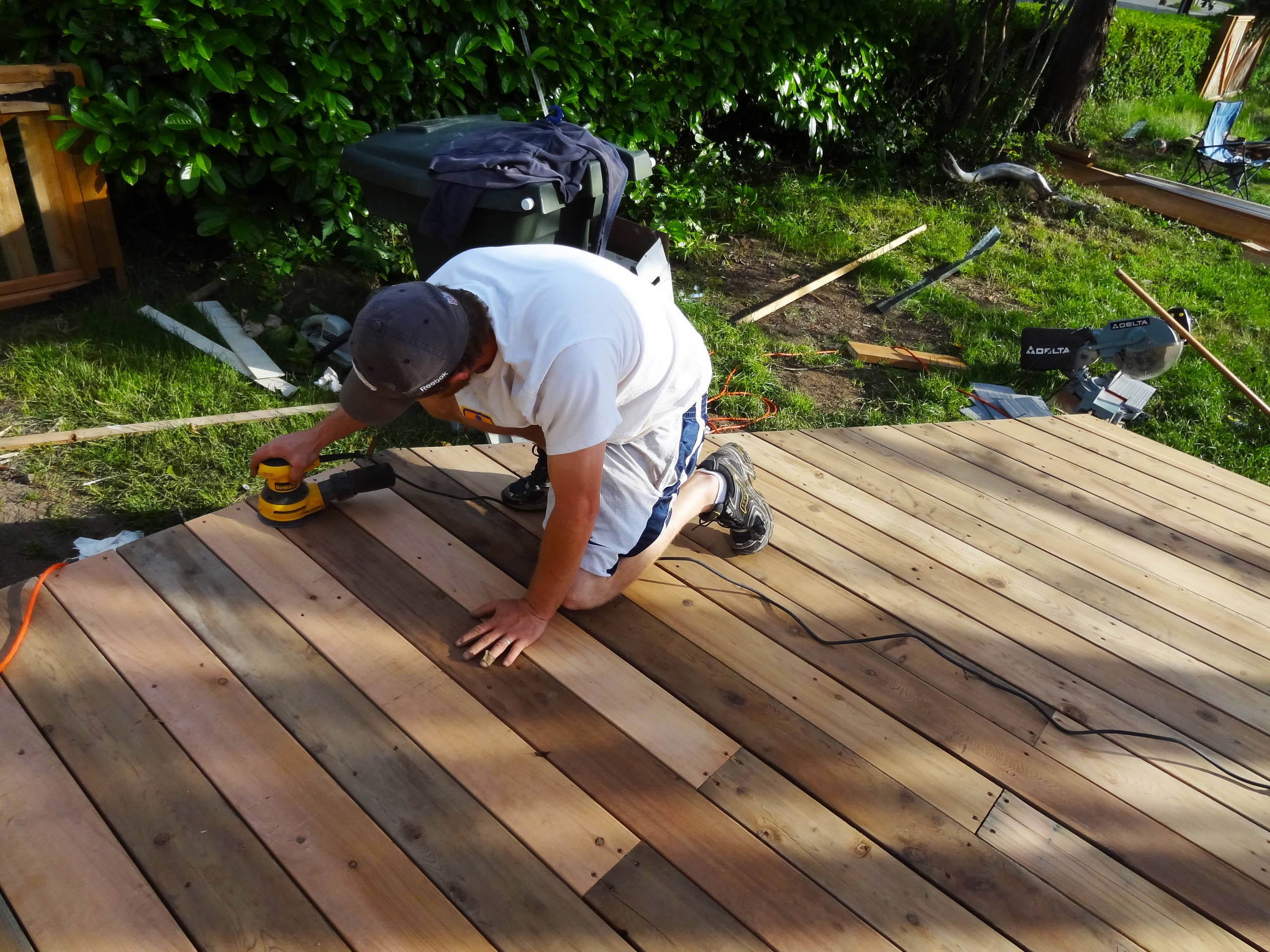 It is vital to make sure you have a clean surface before staining. So, once we were finished sanding, we swept and wiped down the decking to remove any sanding dust.