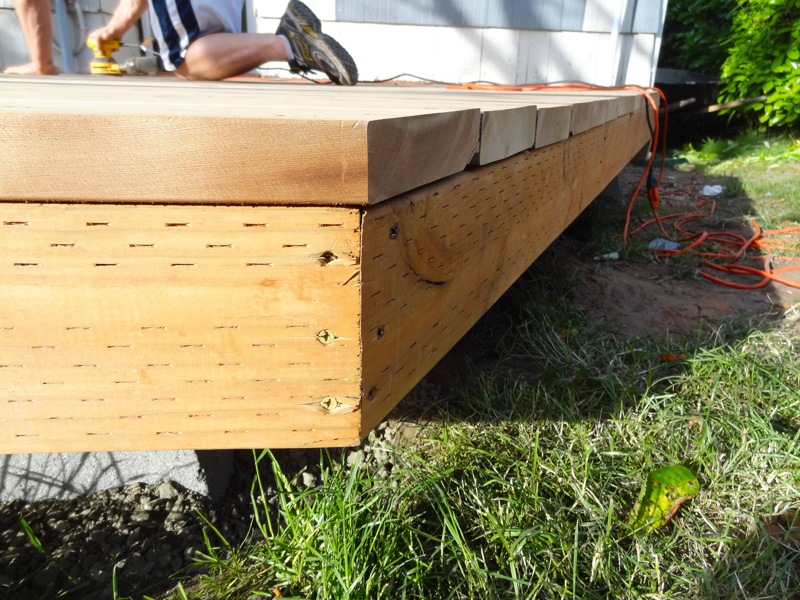 With the foundation secure, attach the cedar decking to the floor joists with two deck screws. Each screw should be countersunk into the board to avoid a tripping hazard.