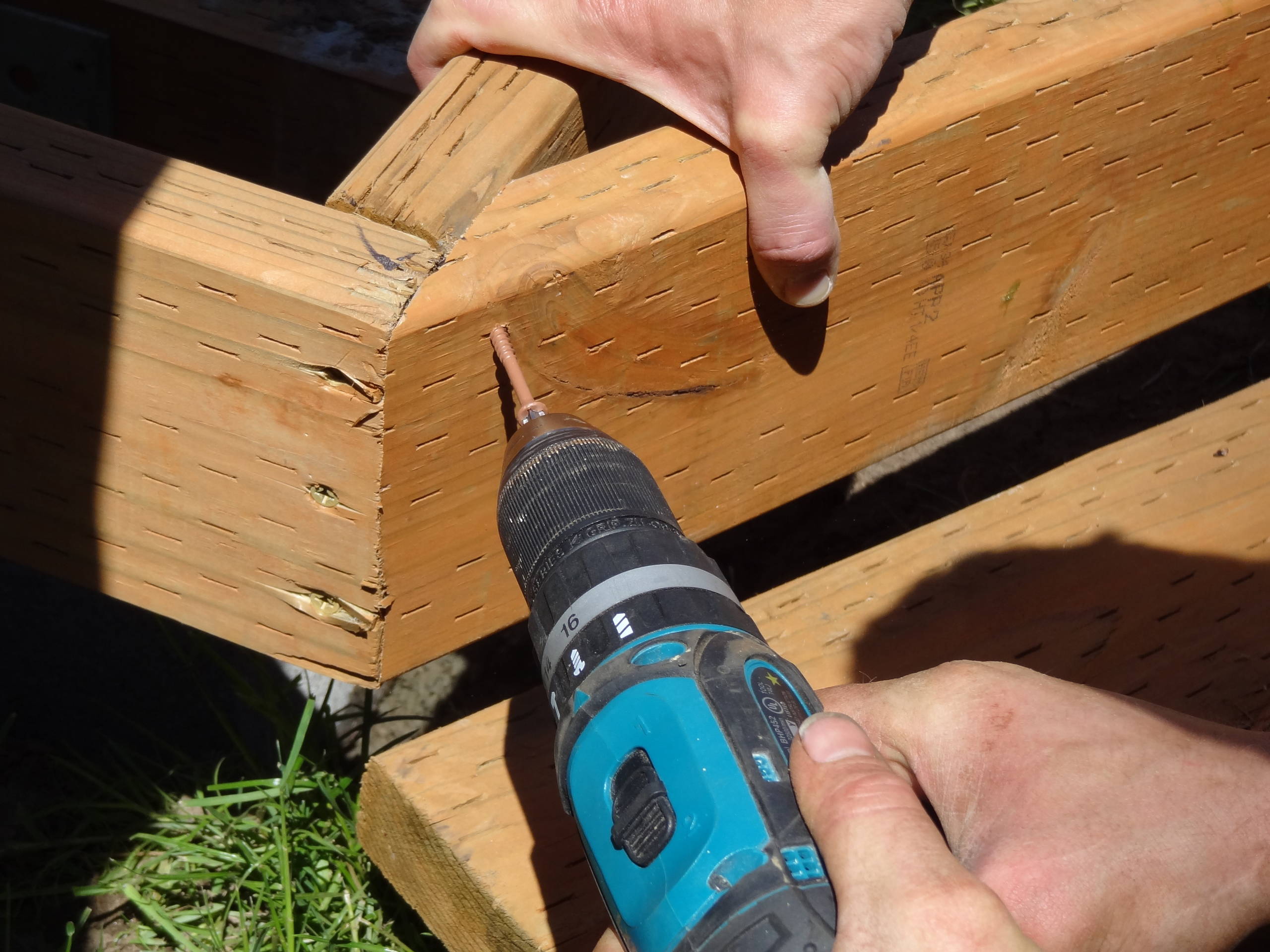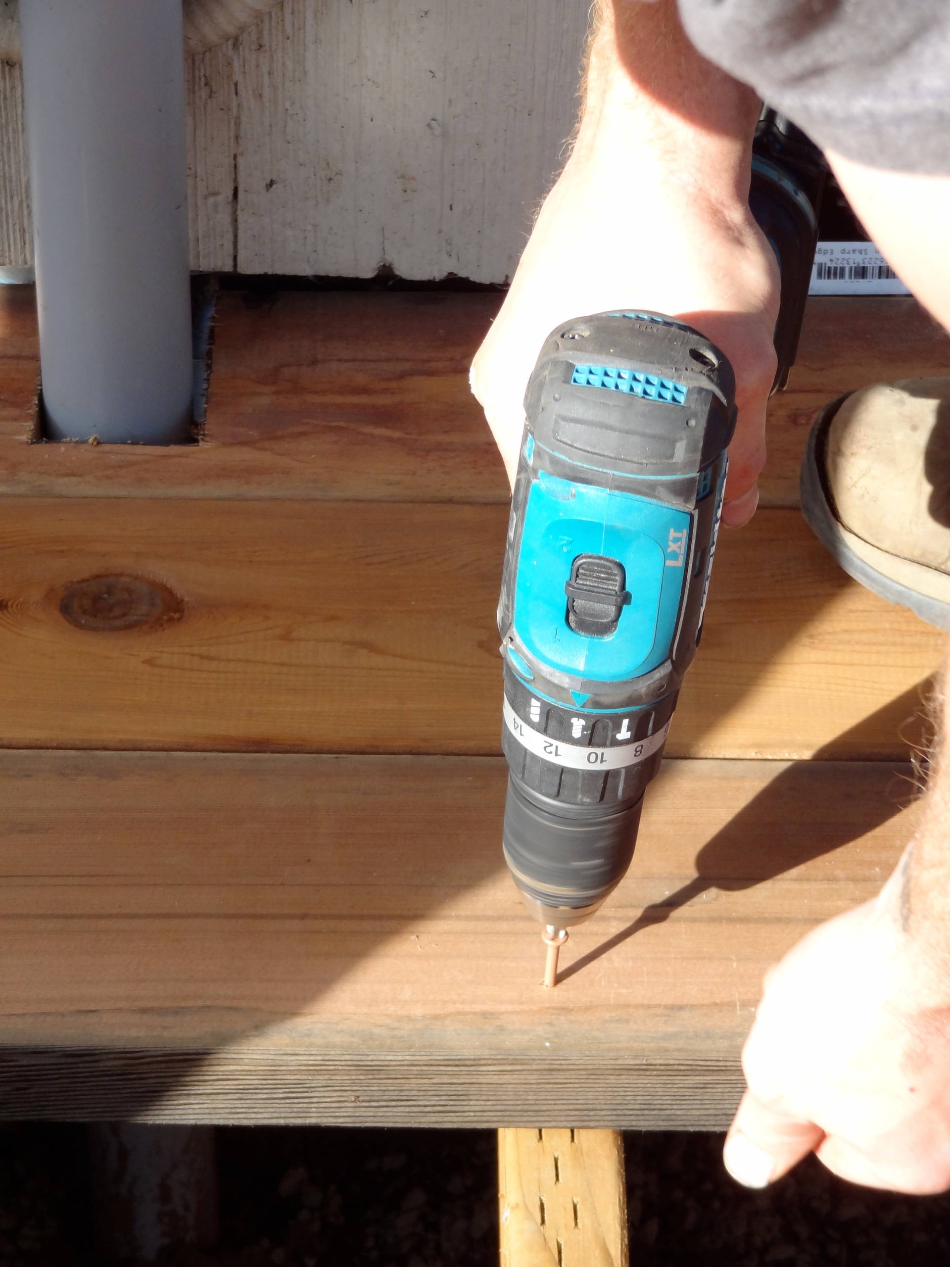 Once you have both the pier blocks and support beams in your desired location, secure the pier blocks into the support beams with deck screws. We chose to use DeckMate deck screws to reduce corrosion from our region's salty ocean air.