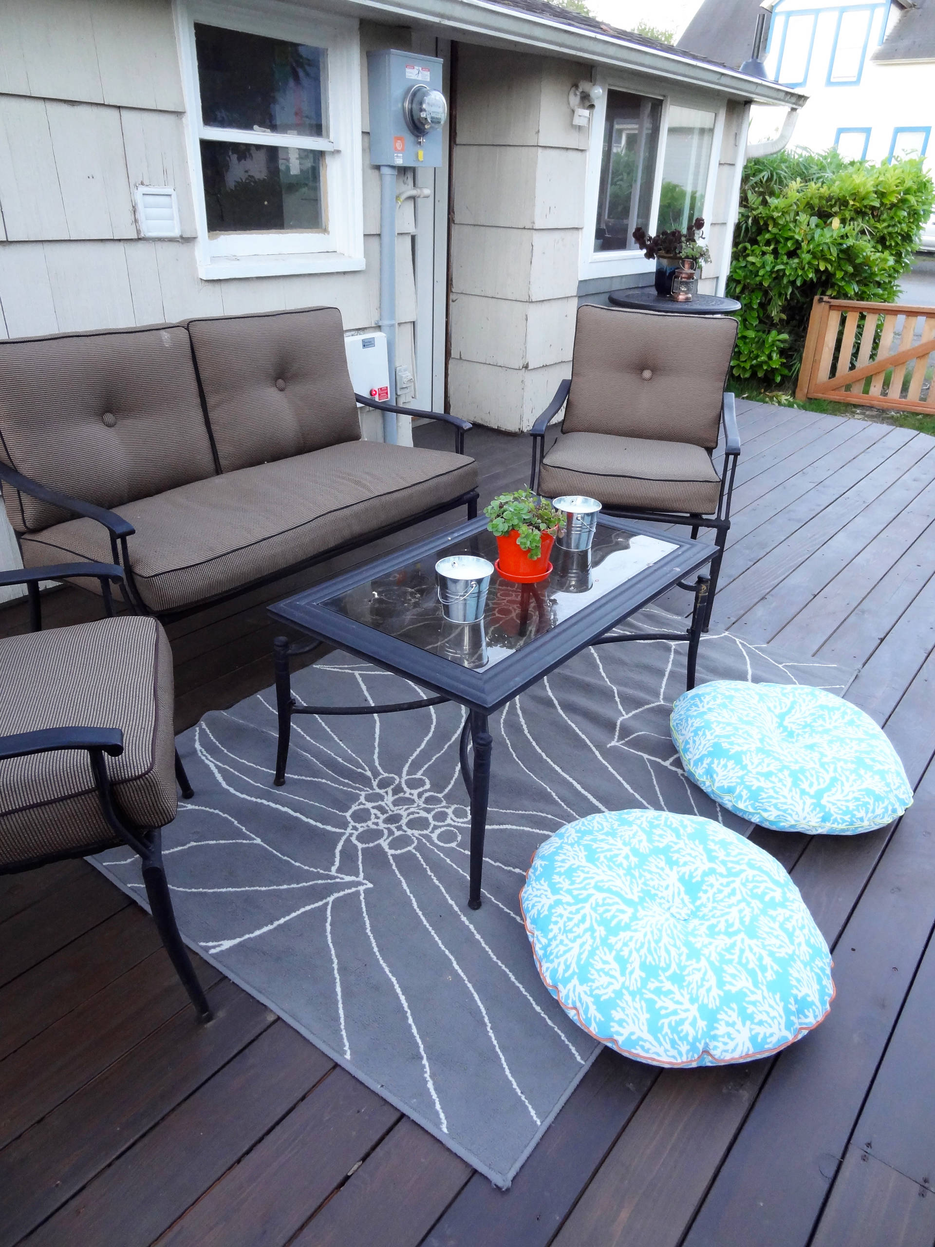 I used my new space to create a cozy outdoor seating area with an outdoor rug, a patio set and floor cushions.