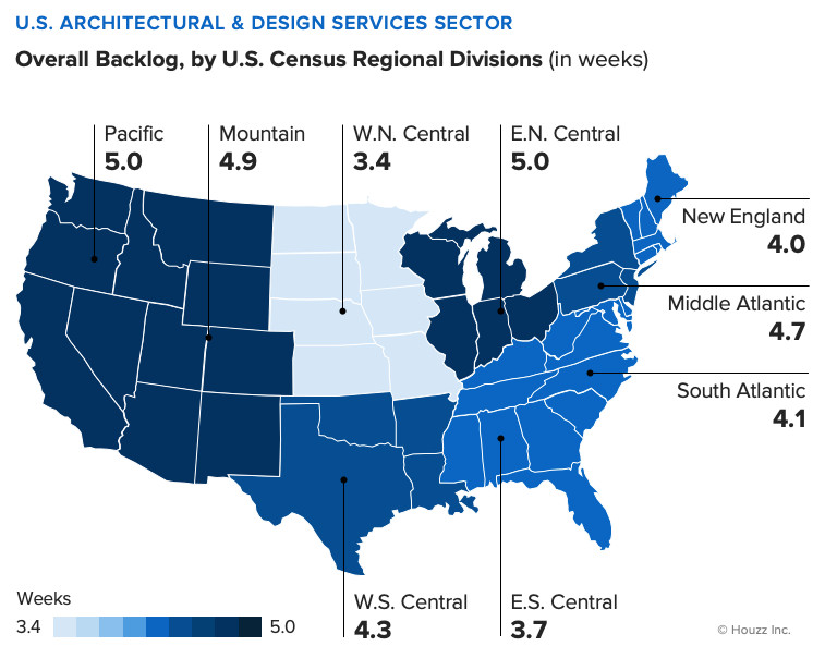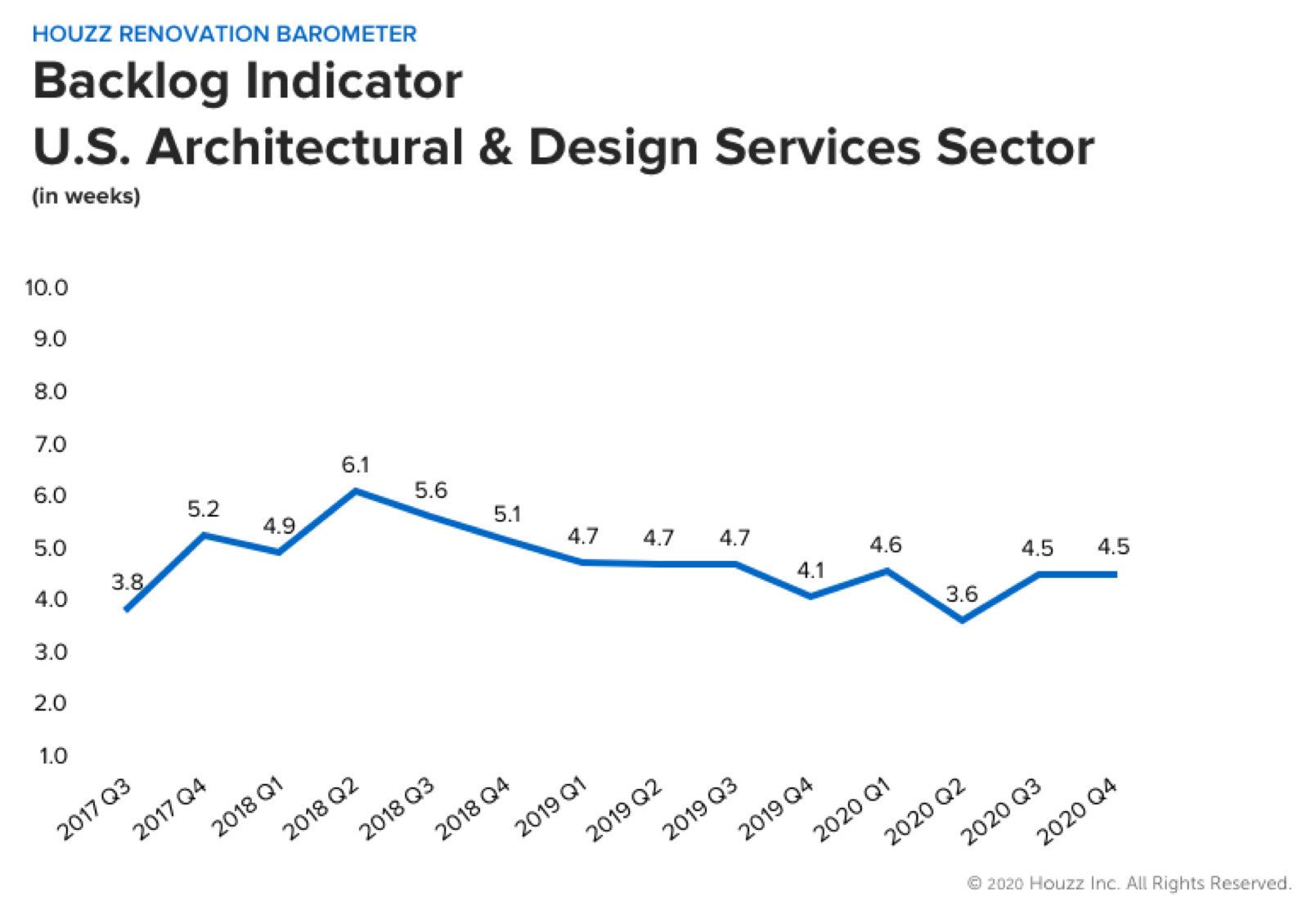 2. Wait times held steady nationally. The Project Backlog Indicator for architectural and design firms averages 4.5 weeks nationally at the start of the fourth quarter of 2020, flat with the start of Q3 2020.