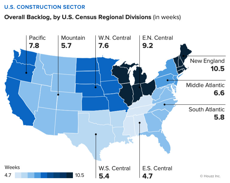 Again, backlogs vary significantly by region, as this map shows. The West North Central division of the U.S. (Iowa, Kansas, Minnesota, Missouri, Nebraska, North Dakota, South Dakota) has the shortest average wait time (3.4 weeks), while the East North Central division (Illinois, Indiana, Michigan, Ohio, Wisconsin) and Pacific division (California, Oregon, Washington) have the longest (5 weeks).