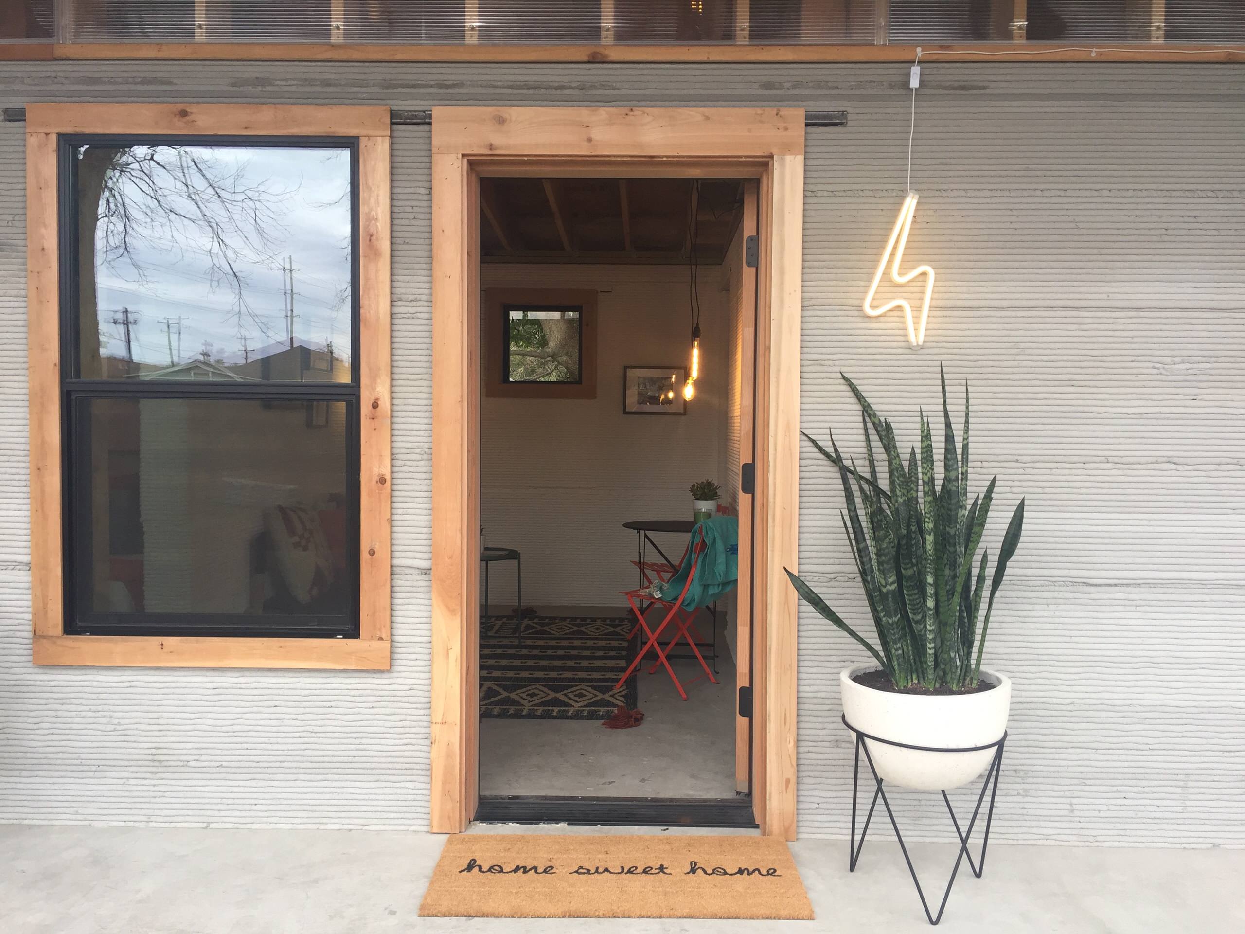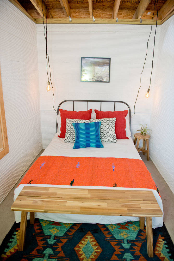 For the reveal of the test home at South by Southwest, Sara Barney of Bandd Design decorated it to fit in with its East Austin location. “I wanted to bring the bohemian, charming, Southwest flavor of this neighborhood into the design,” she says. “Bringing the outside in and keeping the furniture minimalistic was important to reflect how these homes will be used as part of this project in the developing world.”