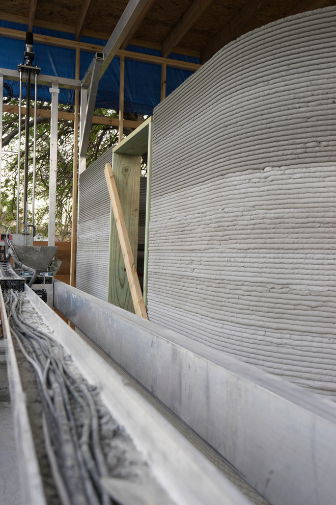 Icon printed the home pictured here in just under 48 hours. The company used a 20-by-11-foot, 2,000-pound gantry-style printer set on tracks. Dubbed the Vulcan I, the machine extrudes a proprietary concrete mix that prints layer by layer, leaving minimal gaps between layers and adjacent walls.