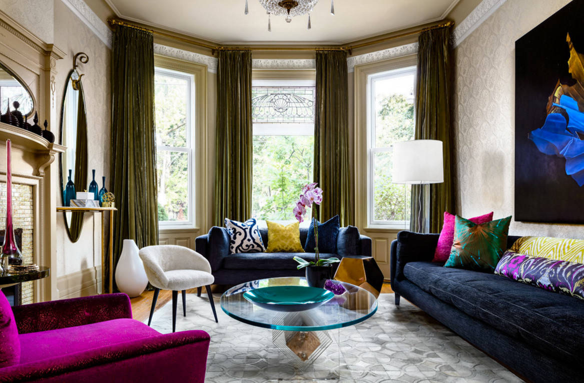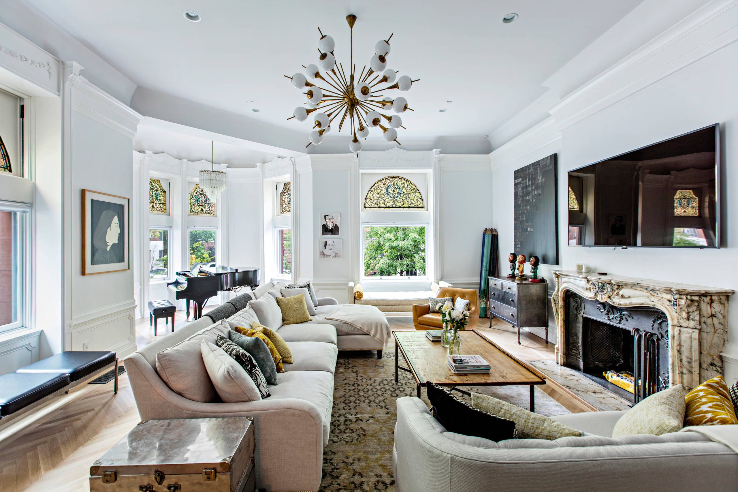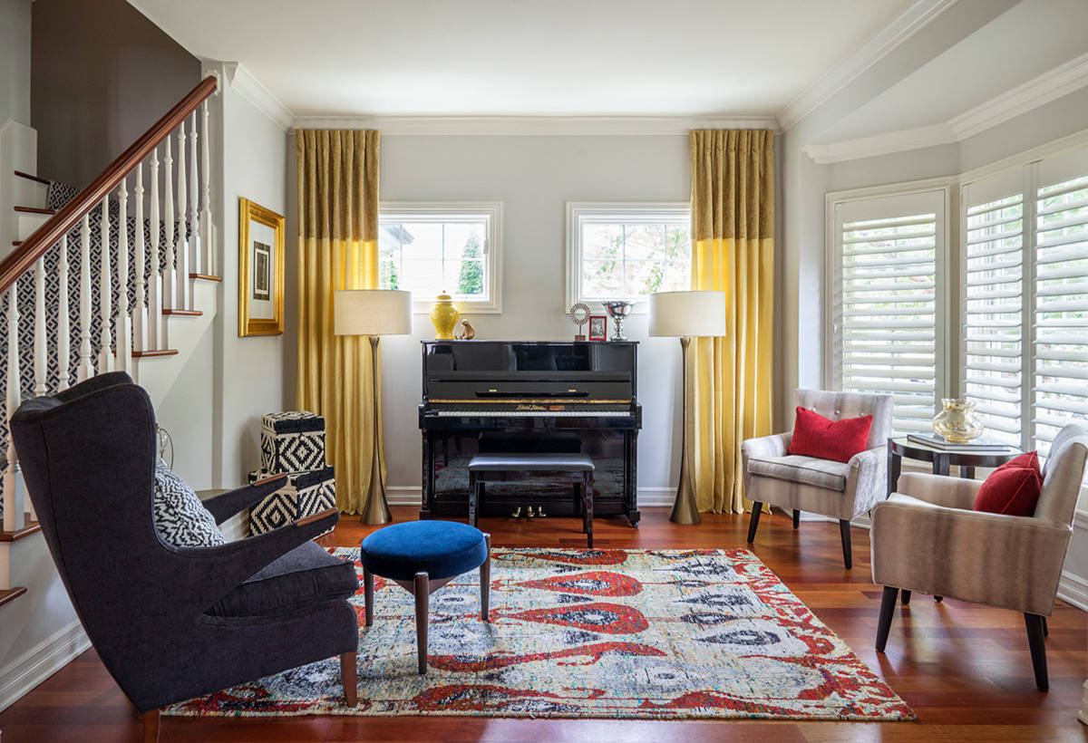 Here, the window is a major focal point when chatting or reading in the daytime, but the piano becomes more of a focus during, say, an evening singalong. Ultimately, the dark, glossy piano is hard to avoid as a dominant focal point, so the designer embraced that with equally vibrant yellow curtains.