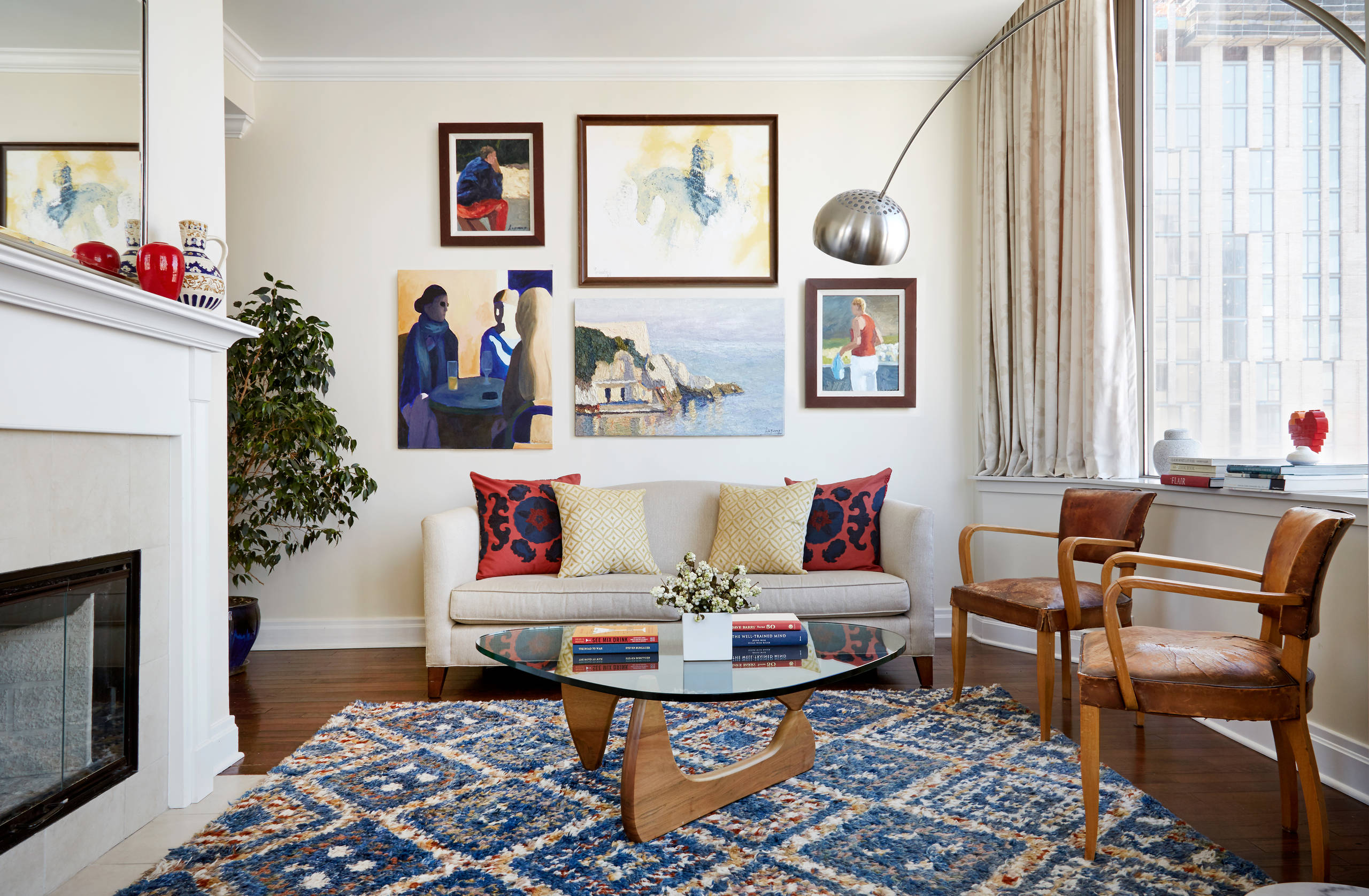 You can then also include a dominant focal point between them that ties the whole space together, or simply leave it out for a more subdued look. To me, if you cover up the painting, the space feels a little lacking in energy, but your preference may vary.