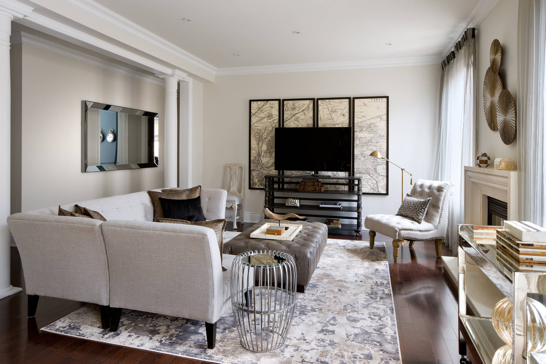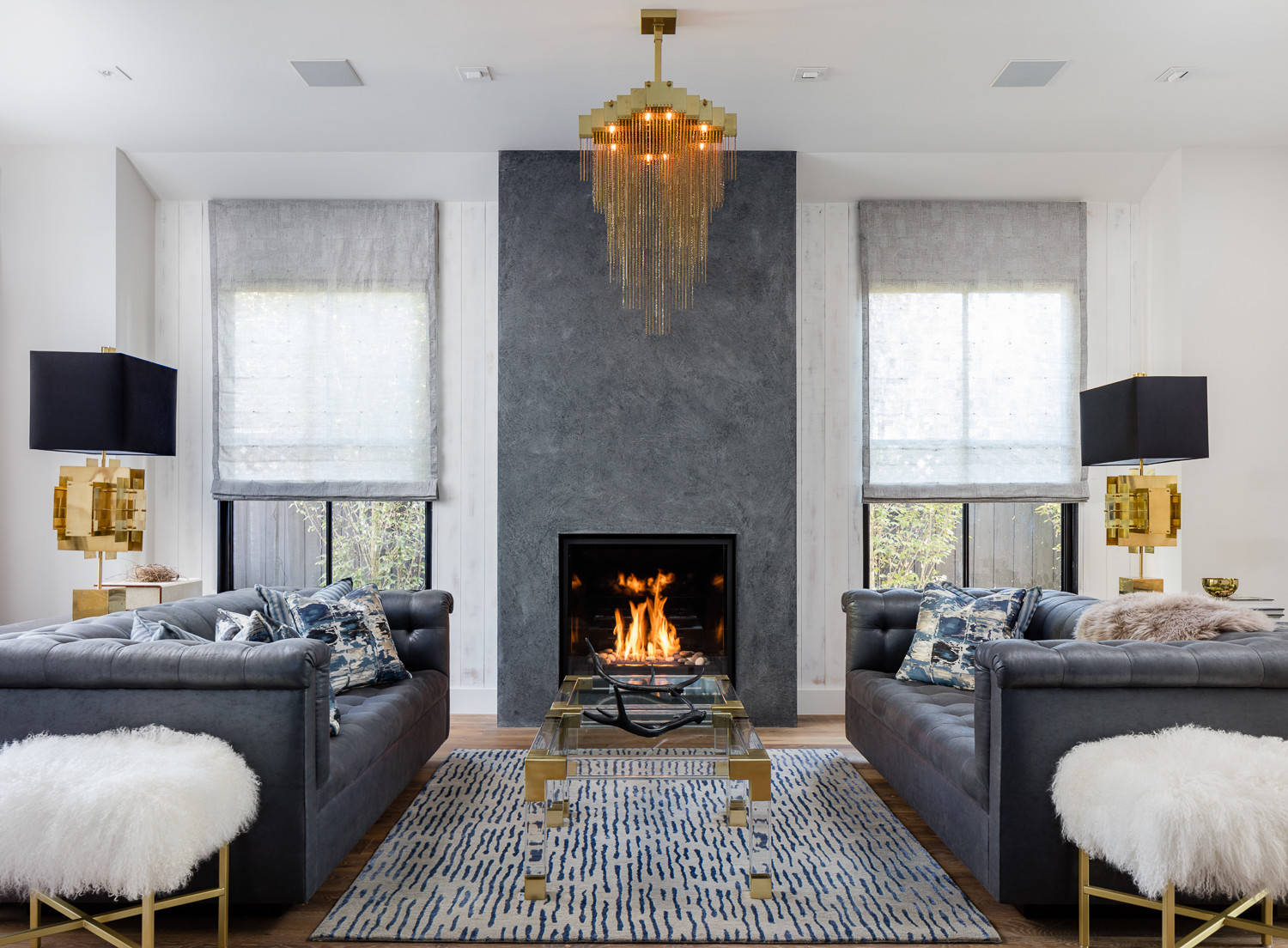 In rooms with multiple focal points, it can give the room an even stronger sense of order to align the biggest focal points along one axis. Here, the sofas face toward an imaginary centerline of the room, and the chandelier and fireplace both sit on that same centerline.