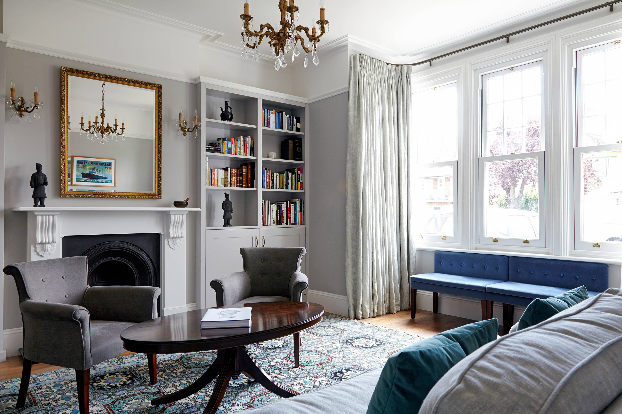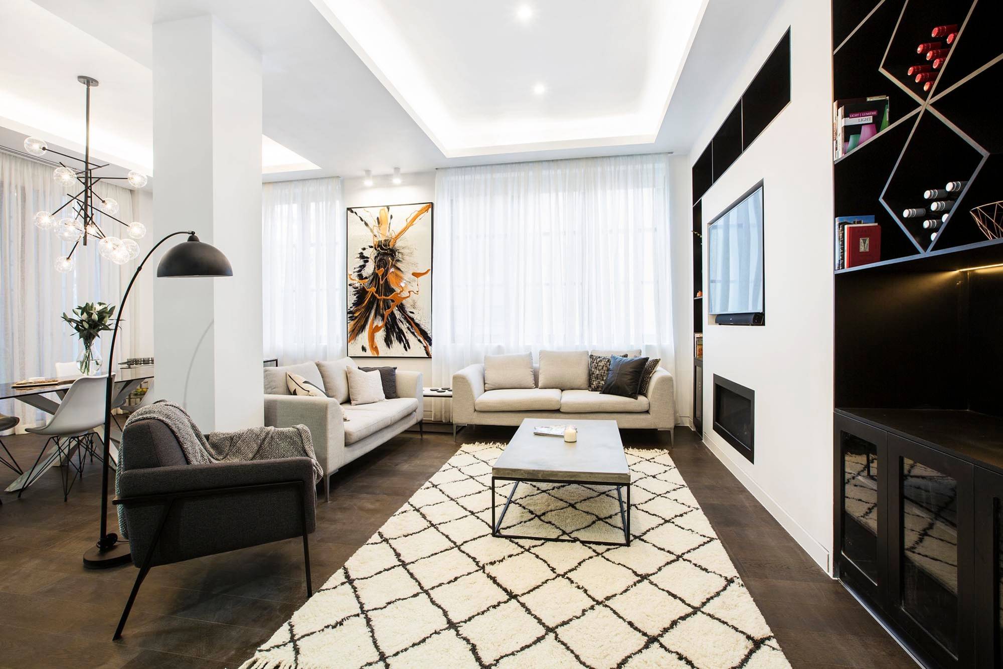 Here, the beautiful carpet grounding this seating area, along with the dark, chunky coffee table and the chandelier, create a focal point in the center of the space, drawing the eye into the room rather than only to the walls.