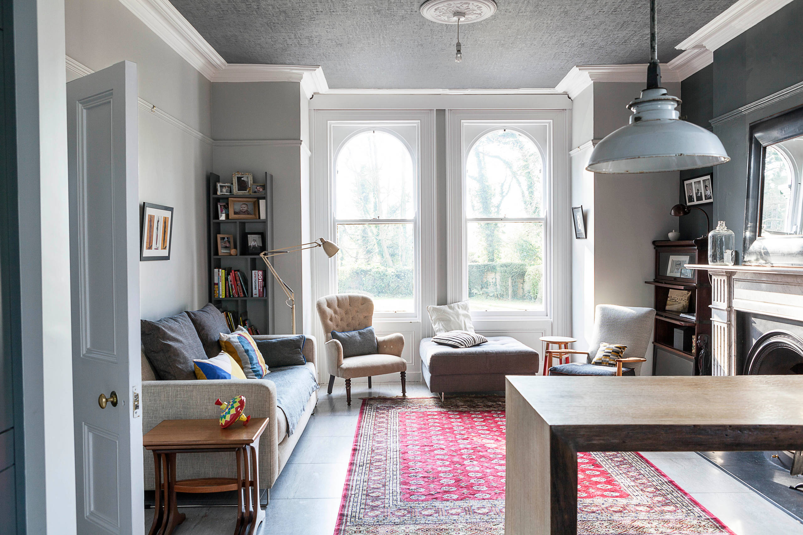 Look back to the entryway photo with the blue door. The red rug is aligned with the door, even though the door is technically a little off-center in the wall. Keeping these dramatic elements along one axis makes them feel connected instead of competitive.