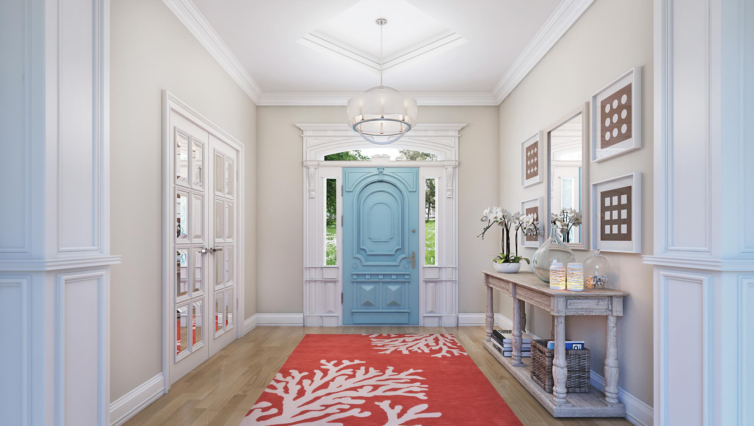 In an entryway, the dominant focal point usually should be the door: It’s a major draw for the eye regardless, so it makes sense to embrace that.
