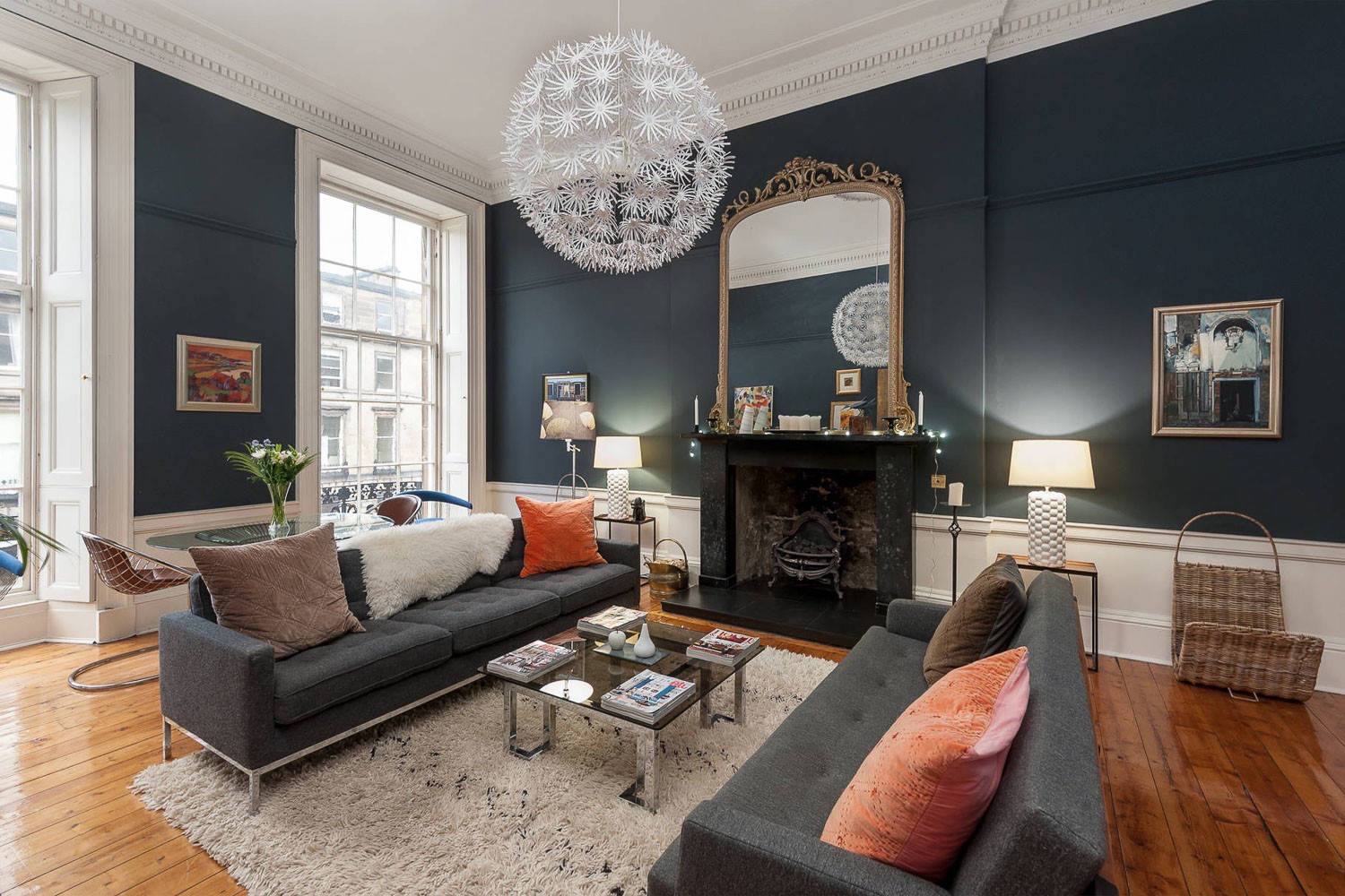 Often, this is where using an “accent wall” comes in: using a dark shade, a bold hue or an eye-catching pattern on a wall to really make that focal point dominate over any others. In this case, the dark paint surrounding the fireplace makes it even more dramatic than the beautiful windows.
