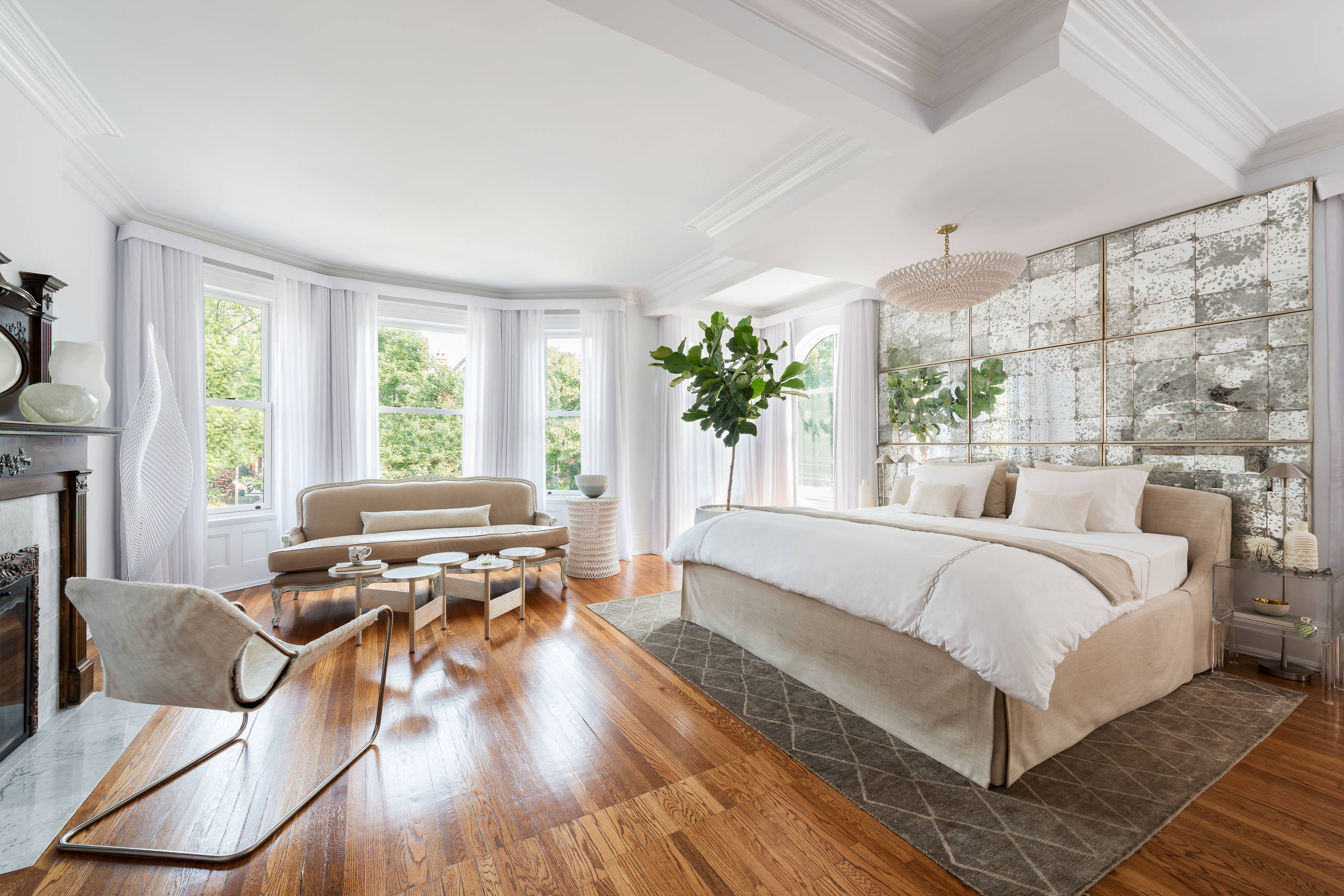 This idea of embracing multiple focal points can apply to any room, but it is especially true for rooms that are a little larger, with multiple functional areas. This luxurious bedroom has a spectacular headboard, but it also has interest in other places, such as the sofa wall with its dreamy windows, or the inviting fireplace.