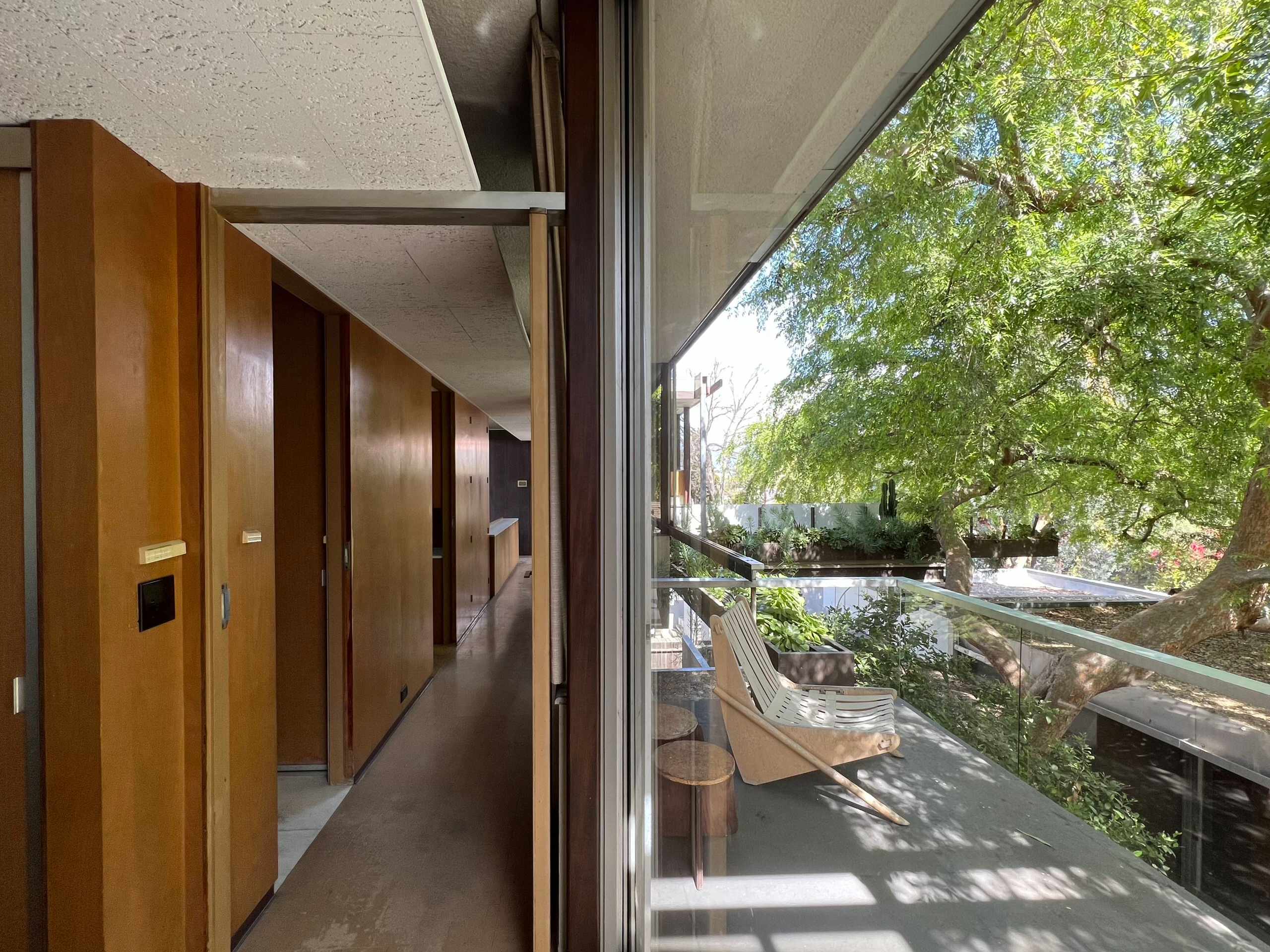 The east-facing terrace off the second floor of the residence. A Neutra Boomerang chair sits in front of a transparent glass rail opening to the private courtyard.